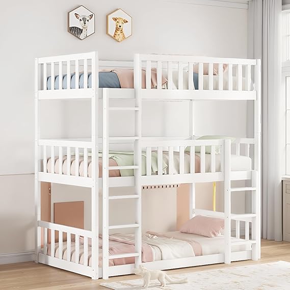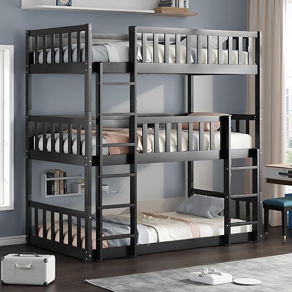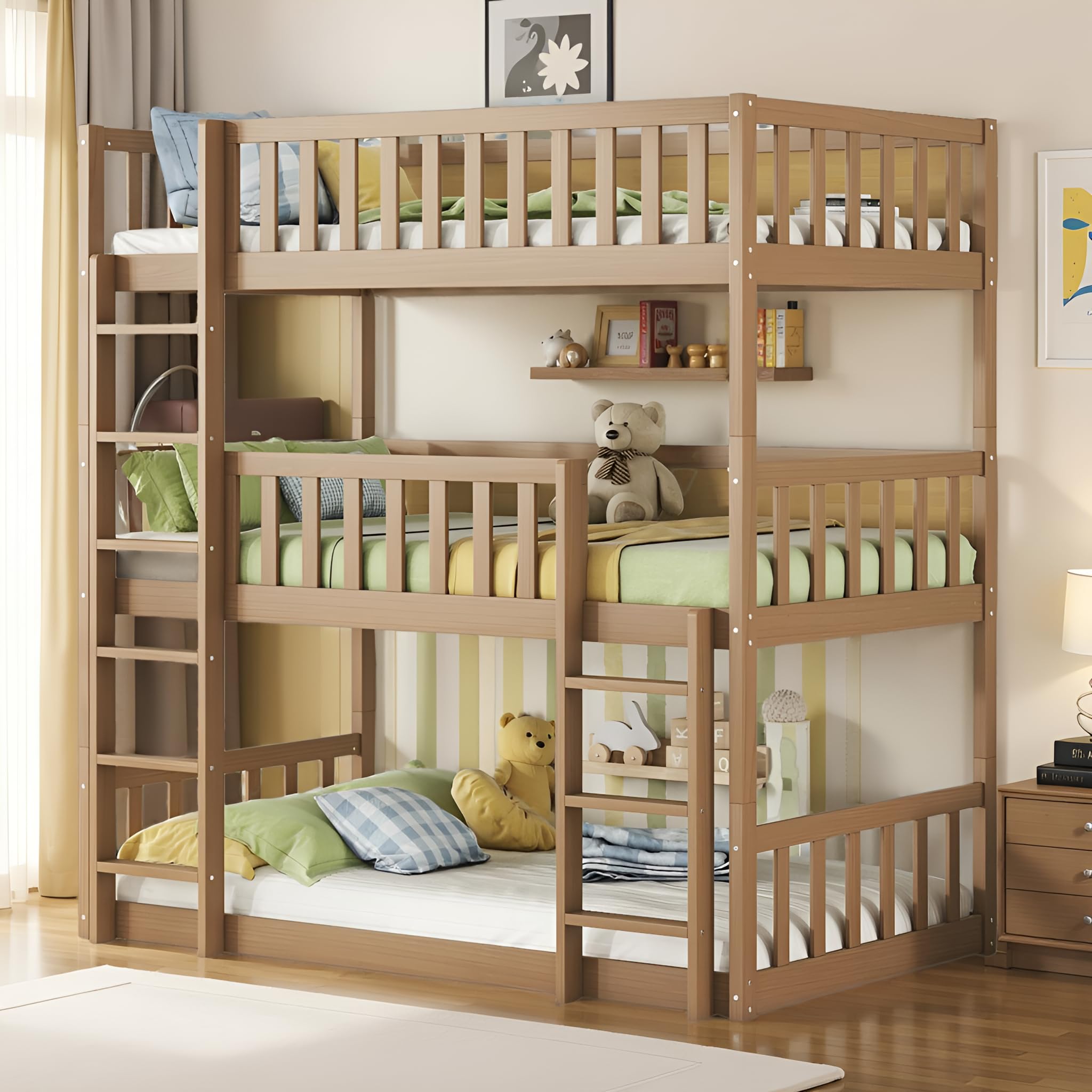 - Safety-First Construction: Premium solid rubber wood and composite wood frame built to last, Two sturdy ladders with secure steps for safe climbing, Full-length guardrails on upper and middle bunks for added protection.