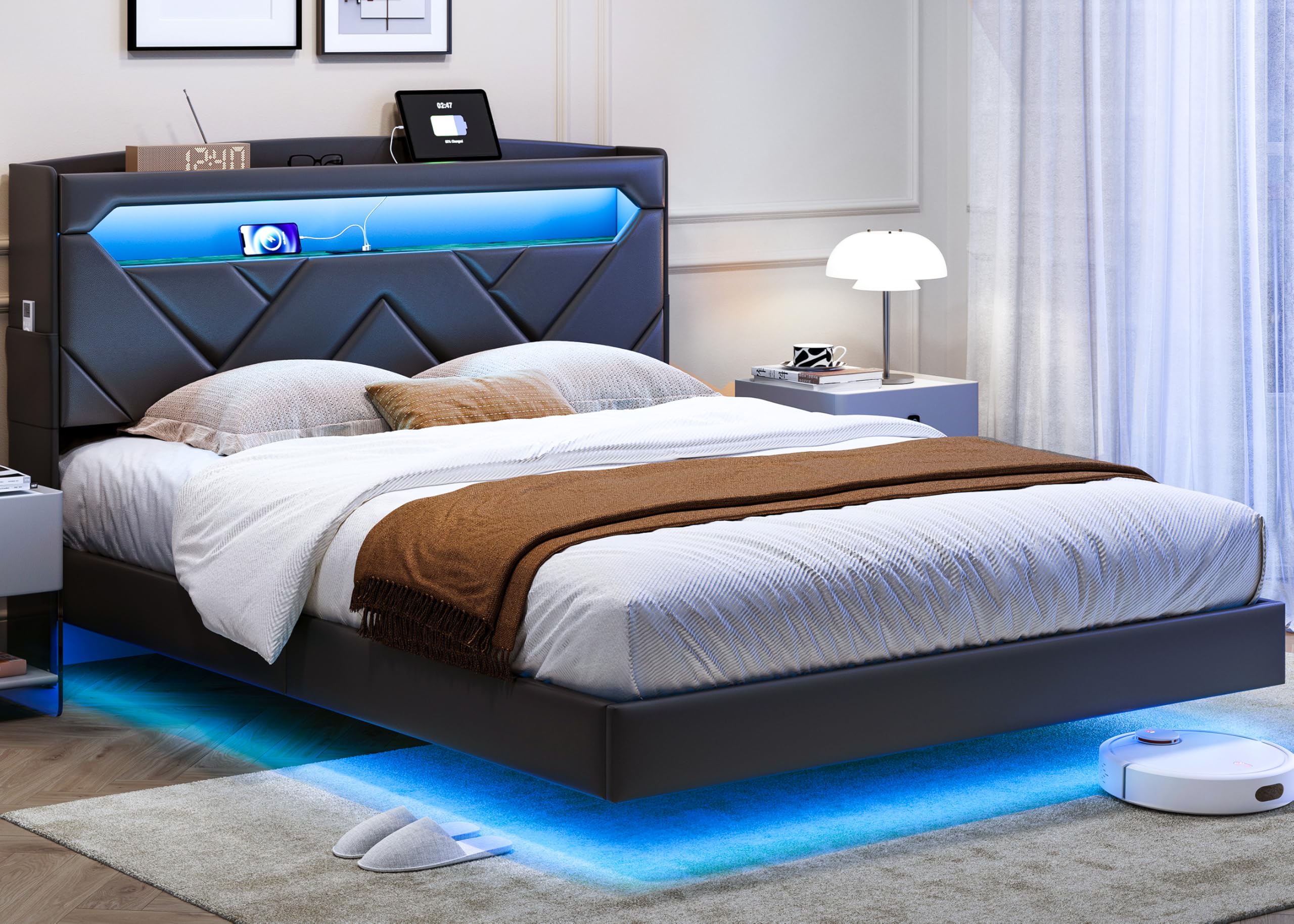 - MODERN FLOATING BED: The unique hidden bed foot design combined with the side light strips under the bed, gives the impression the bed floats above the ground, which not only balances stability and is also very aesthetically pleasing. Infusing your space with a contemporary, space-saving charm that complements any bedding set, the full upholstered bed frame adds personality and modern sense of technology to your bedroom style. The bed frame with storage brings an innovative visual experience.