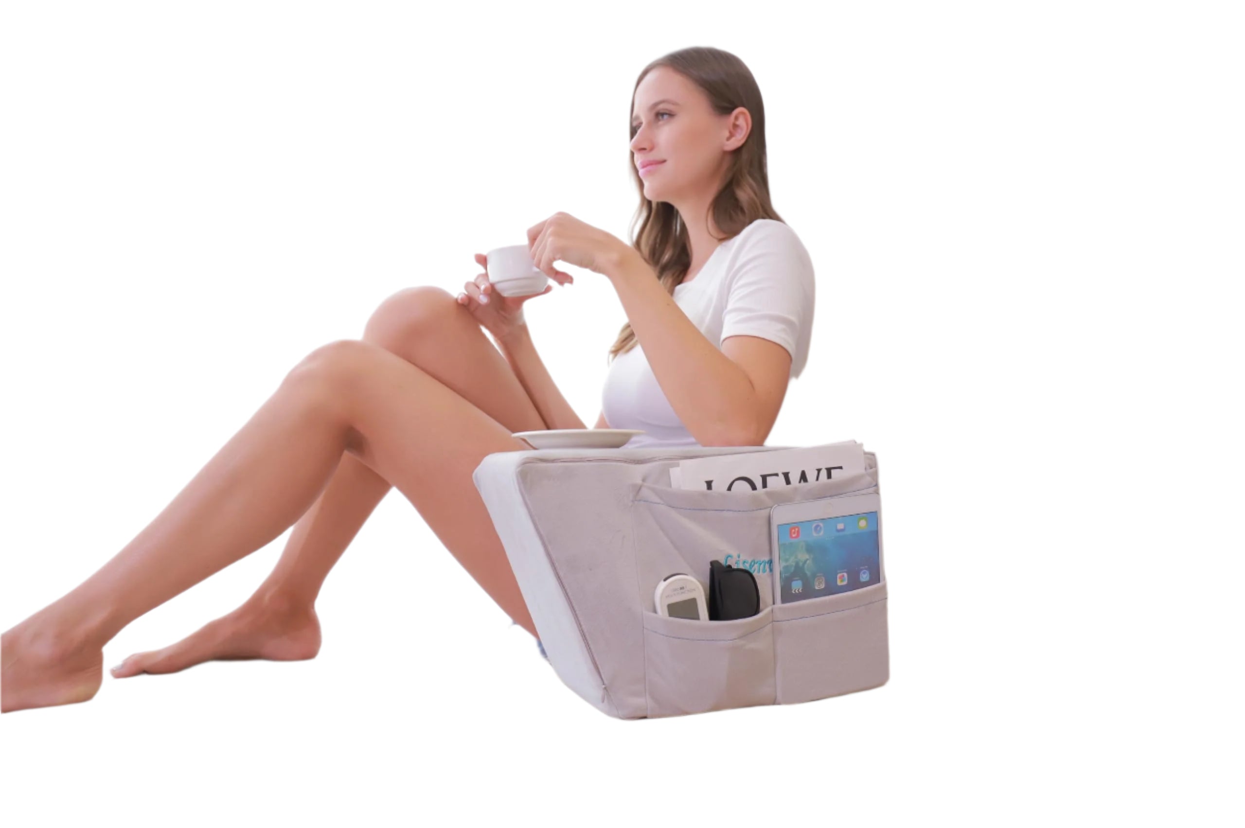 - [PORTABLE BED REST PILLOW WITH EXTRA 3 POCKETS] With dimensions L:15" * W:7.5" * H:9.5", you can easily carry the pillow with arms to another room or keep it on the floor. In addition, 3 convenient pockets in the side of chair pillow for bed help you to store your items so that you don’t need to get up once you’ve gotten comfortable. The two smaller side pockets are designed for storing remote, phones or glasses, while the larger one is perfect for holding magazines or books