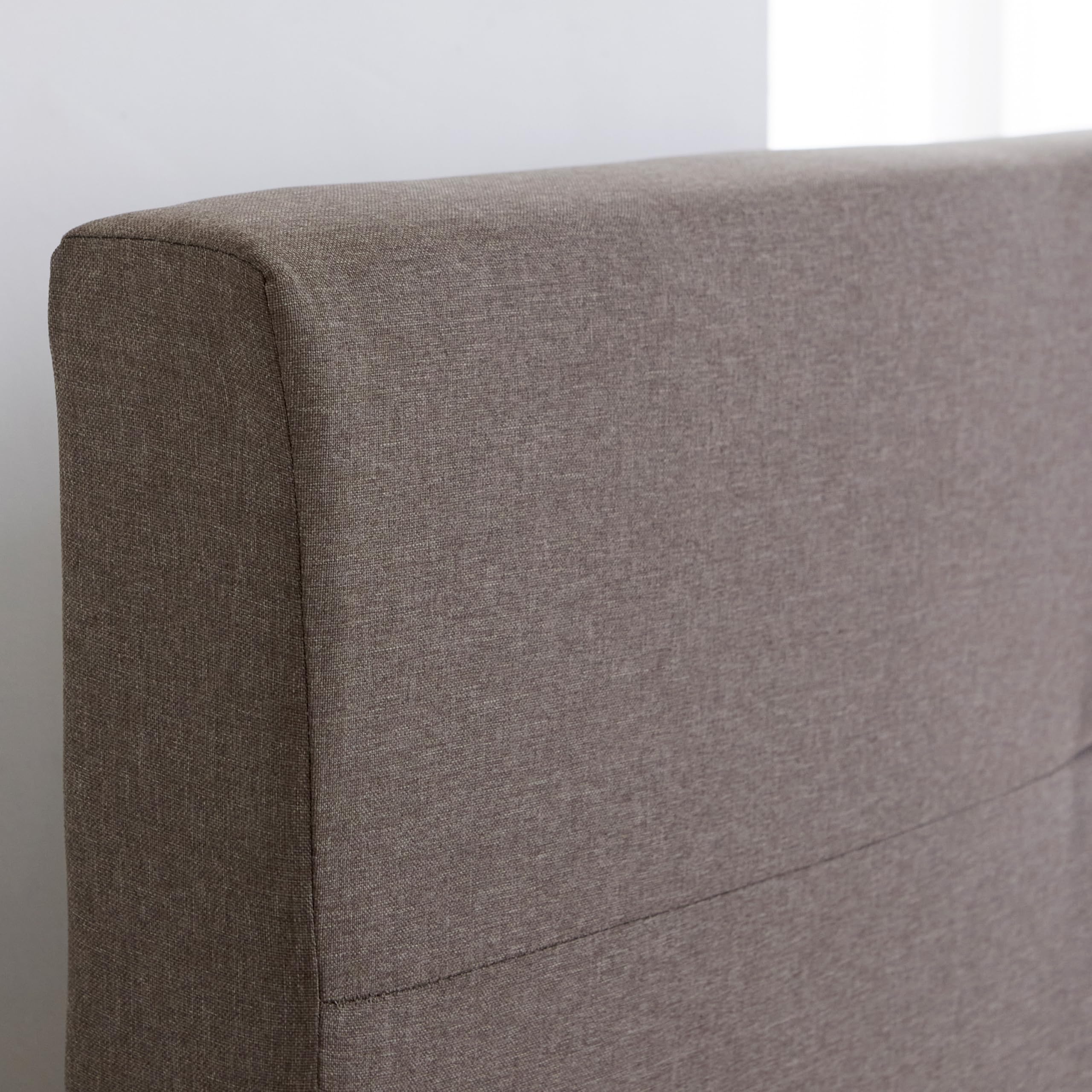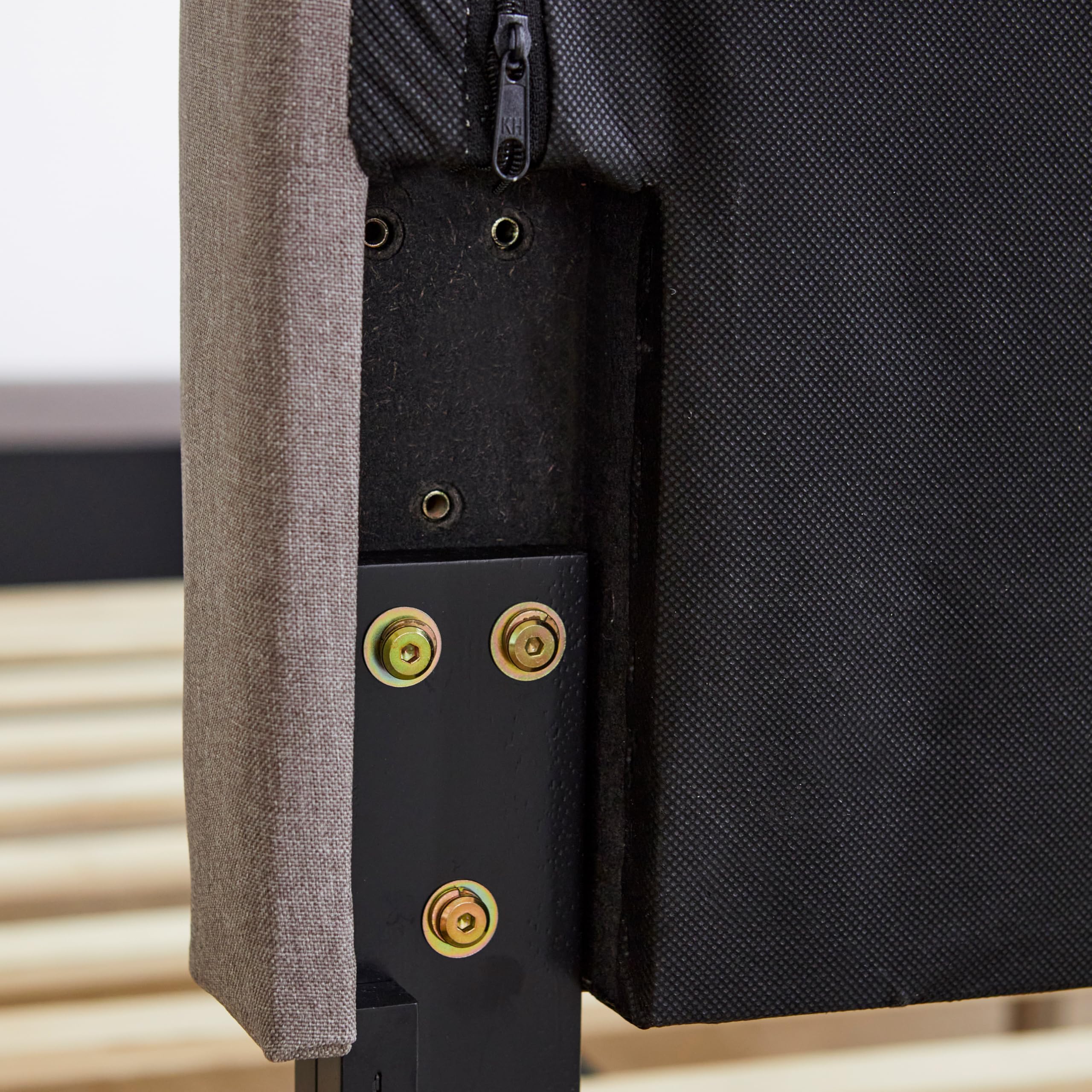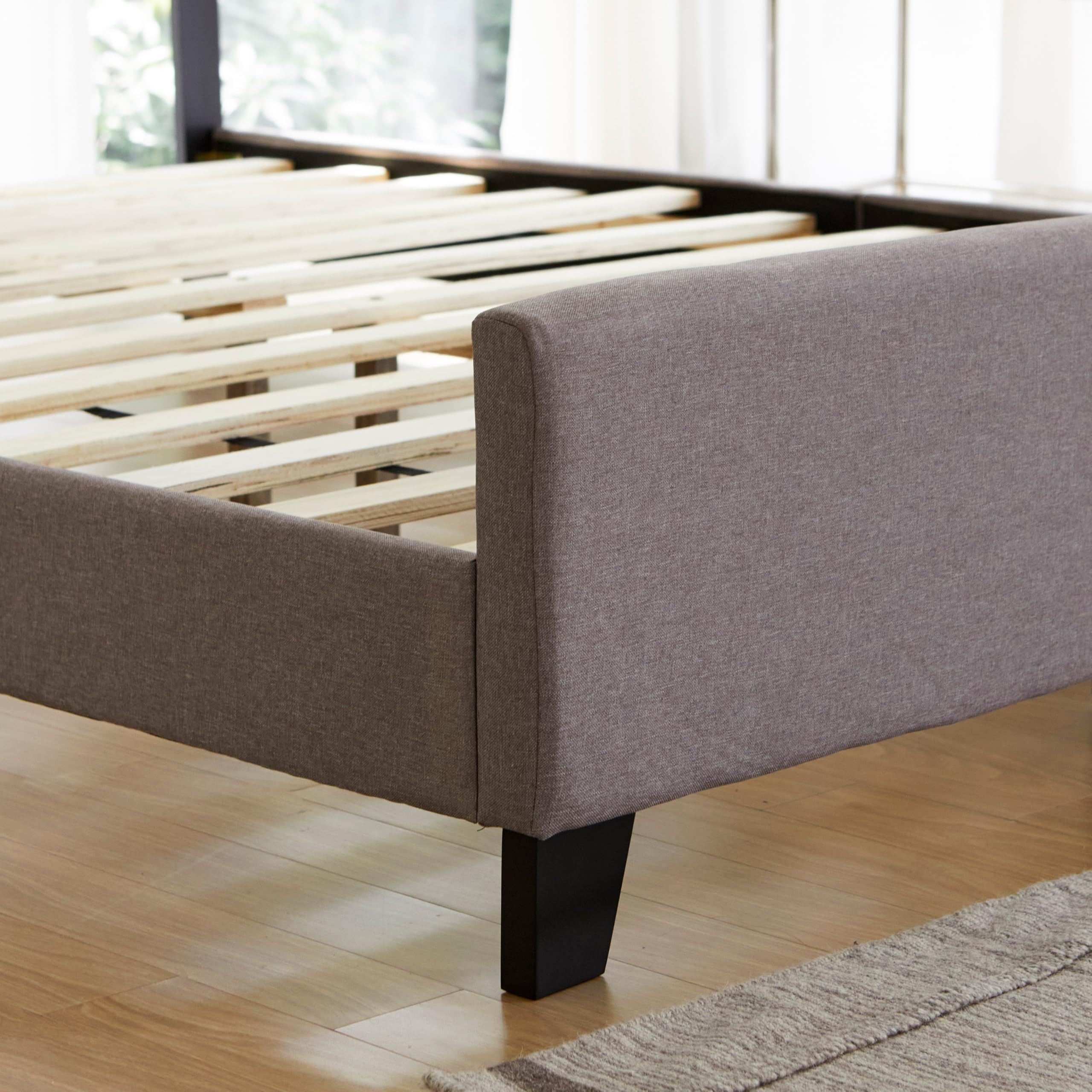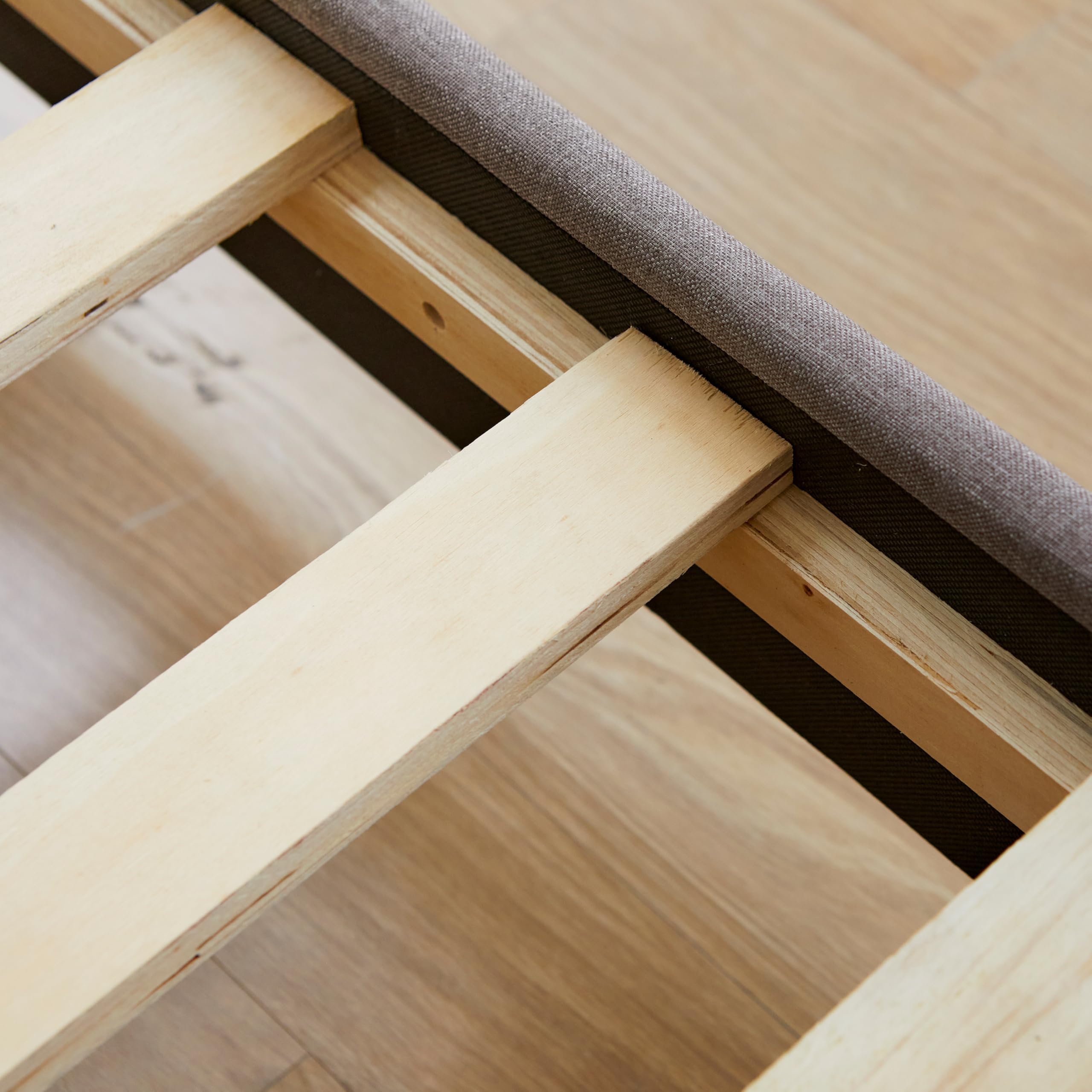 - Woven fabric upholstery with solidwood framework. The 12 piece wooden slat system with wooden center rail and support rail provides reliable and long lasting support.