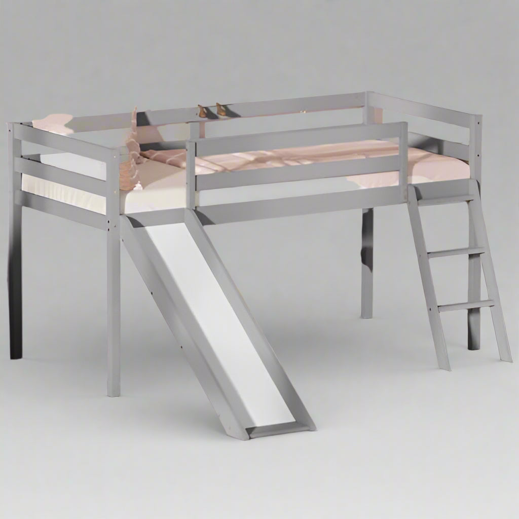 - Our twin low loft bed comes with smooth slide that can bring extra fun for kids. The safe ladder is attached to the side of the bed for kids to climb up and down. And the slide and stair can be interchanged to suit different sized rooms or placements