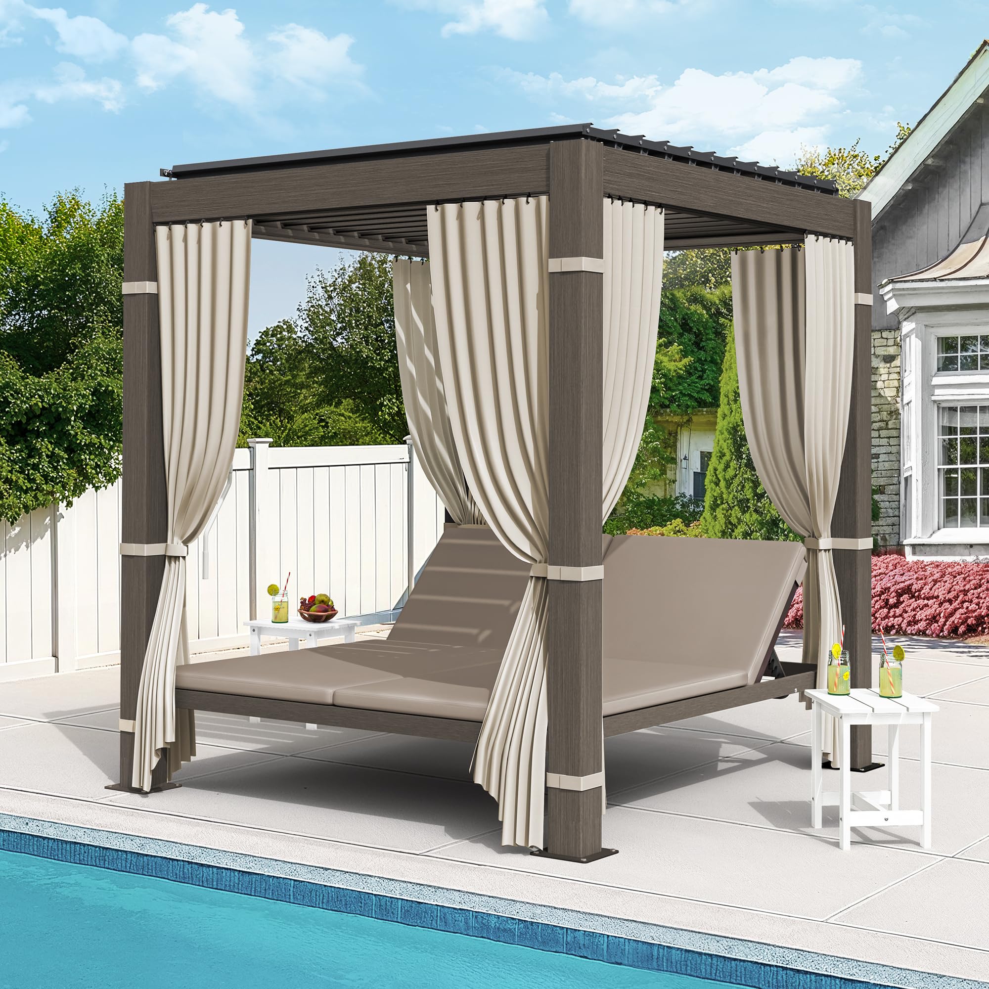 - Patio chaise lounge & aluminum louvered pergola set creates a complete resort-style retreat. 4-sided privacy canopy provides VIP-level shading. The best choice to your garden, backyard or poolside, providing comfort for 2 to 6 pepole to relax