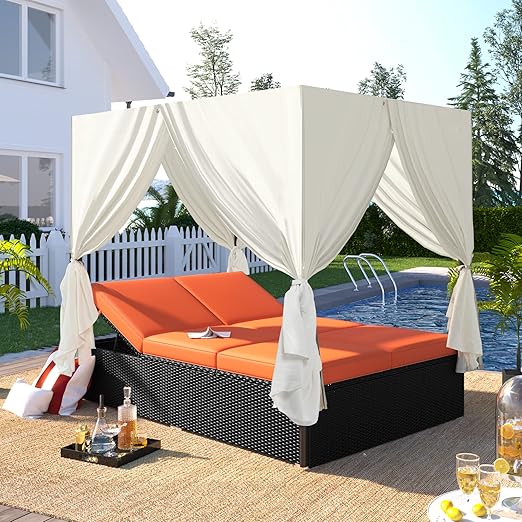 - This outdoor sunbed with four-sided canopy and overhead curtains provides both shade and privacy and the canopy can be tied side to keep the panels open as needed. The curtains can also be removed and stored so you can enjoy the sun freely. The sun lounger is easy to assemble.