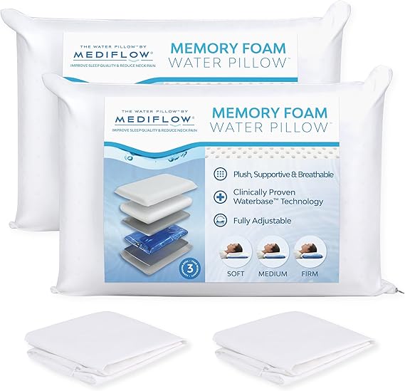 - PREMIUM BED PILLOW ENHANCES SLEEP QUALITY: Wake up refreshed with the Mediflow Original Memory Foam Water Pillow. This firm memory foam pillow adapts to your head and neck's shape, relieving discomfort and promoting a restful night's sleep.