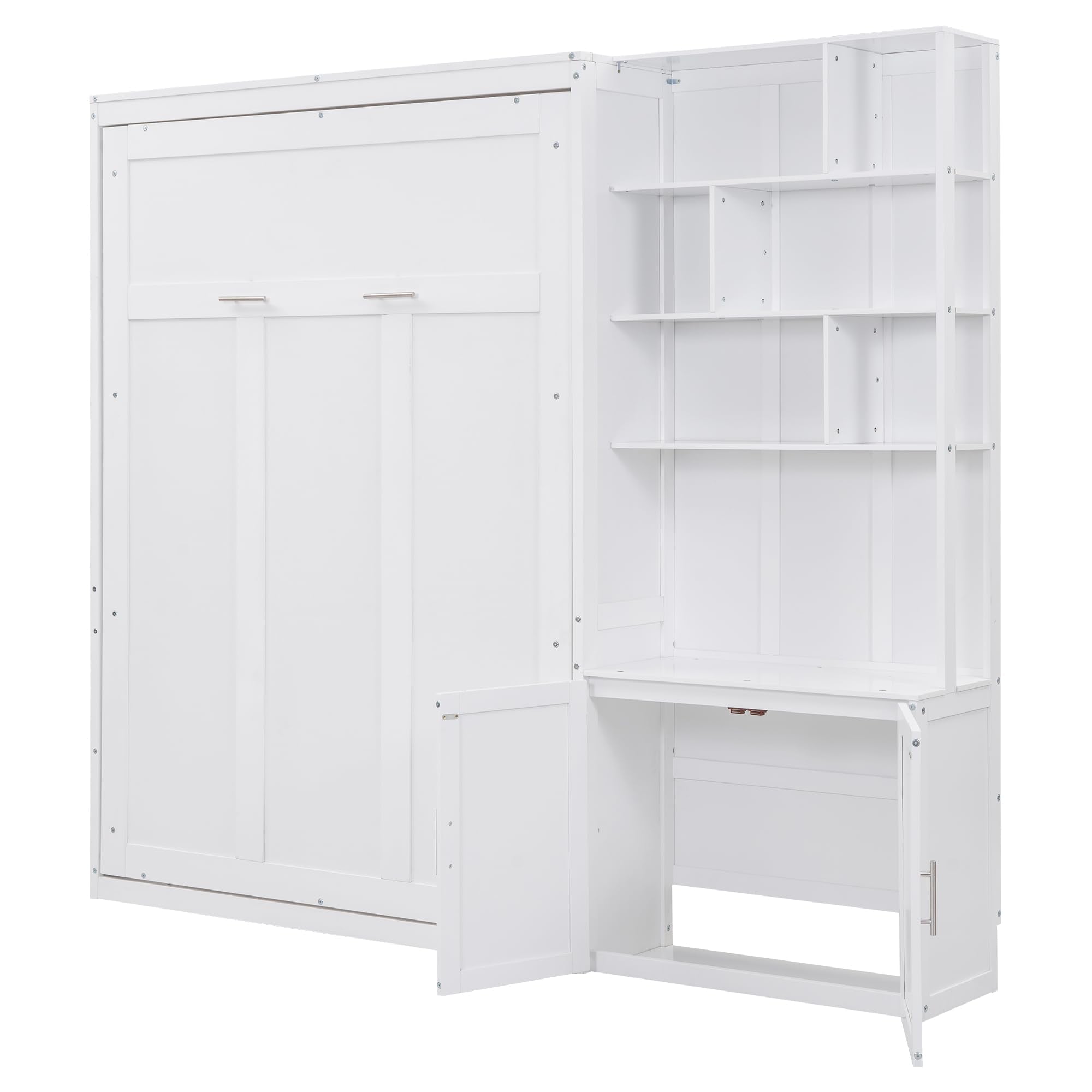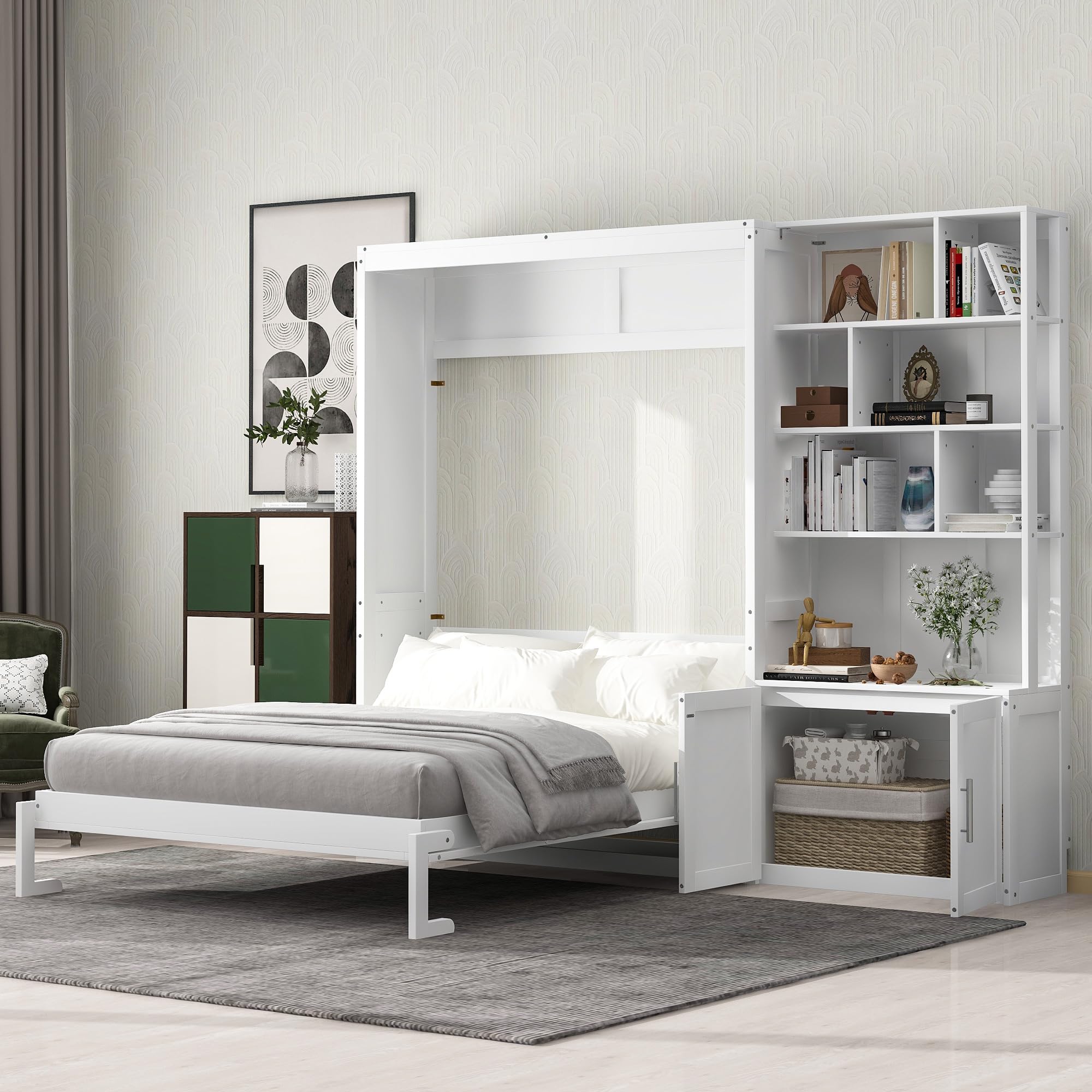 Size Murphy Bed, White Wood Wall Bed Cabinet with Multiple Storage Shelves