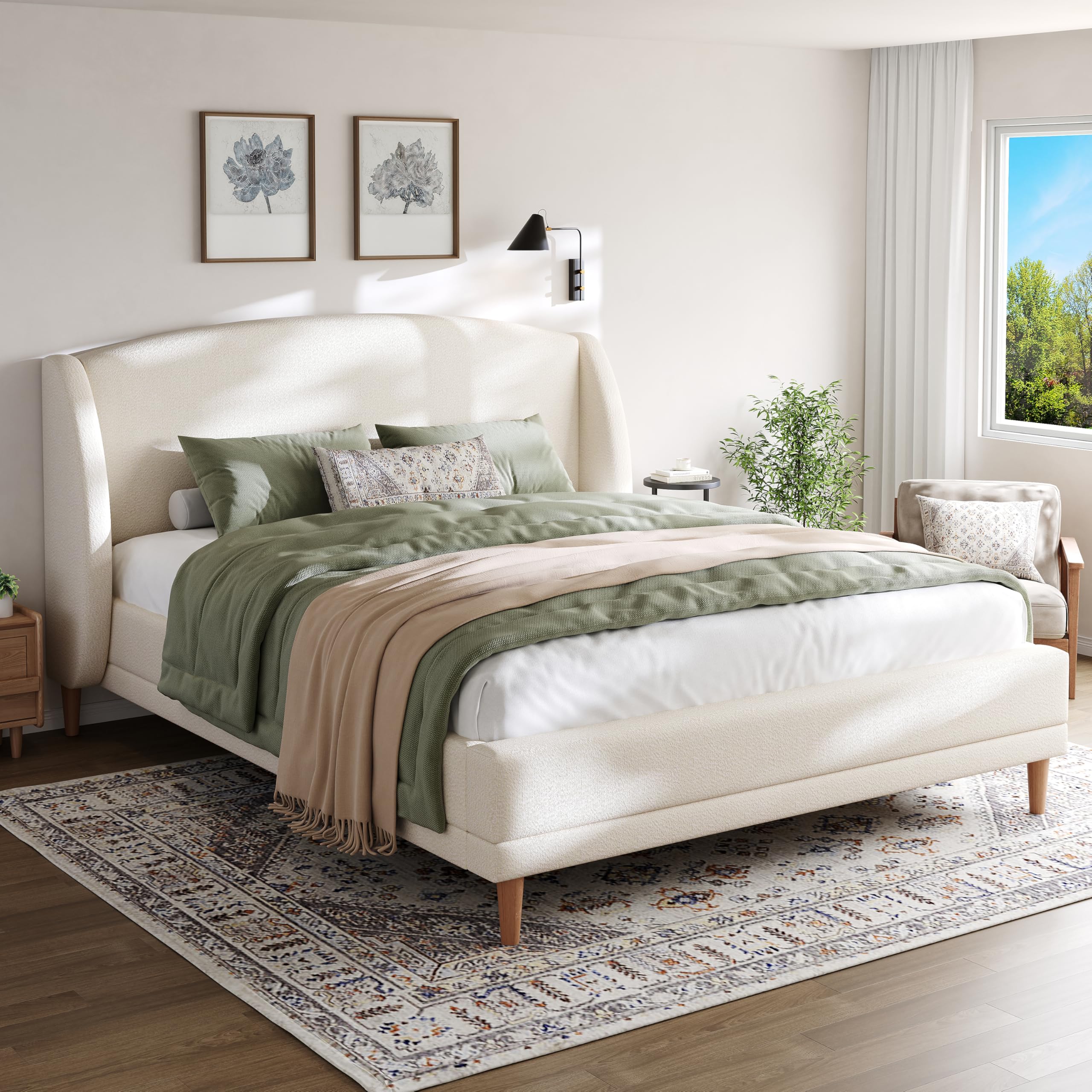 Queen Size Upholstered Platform Bed, Boucle Fabric and Wingback Headboard