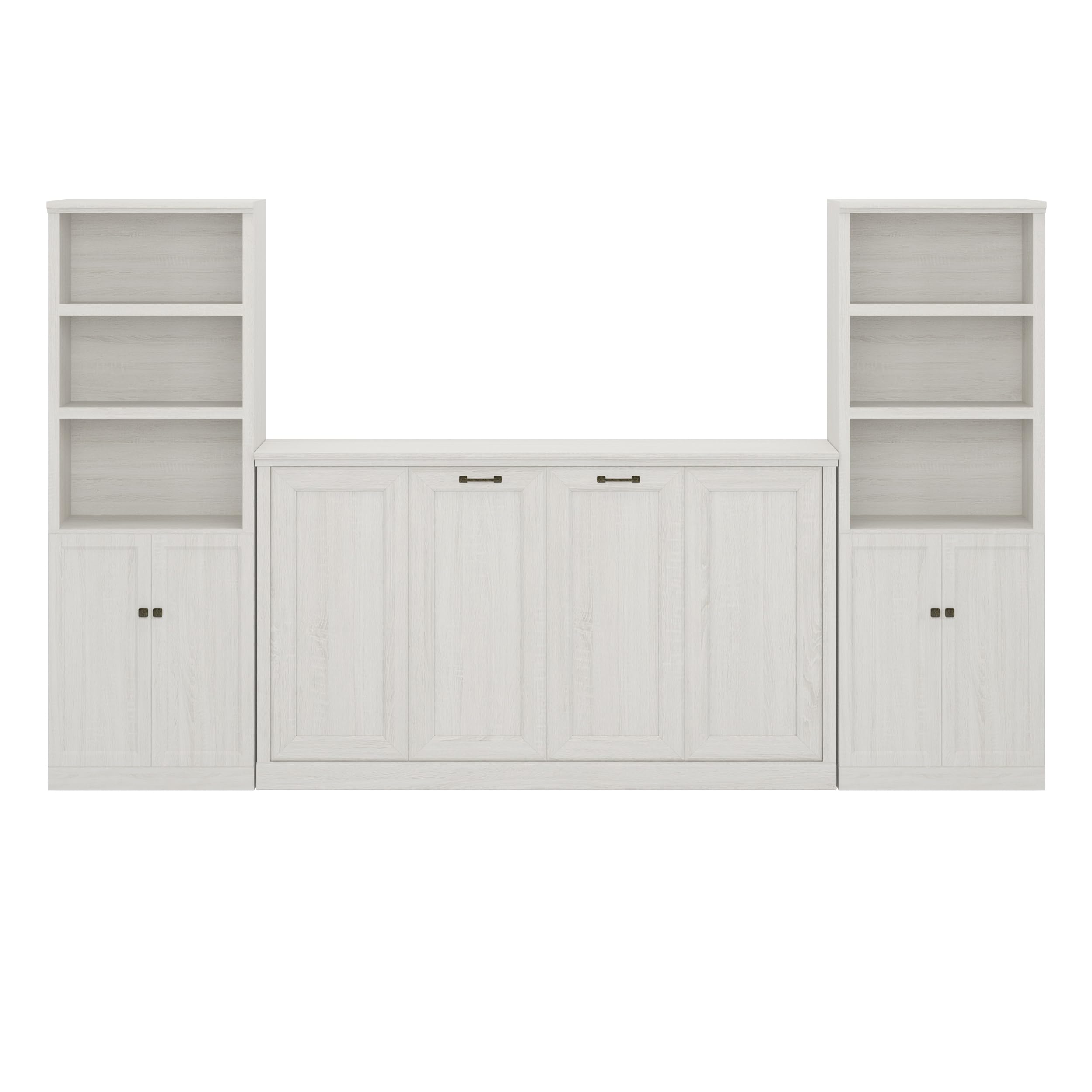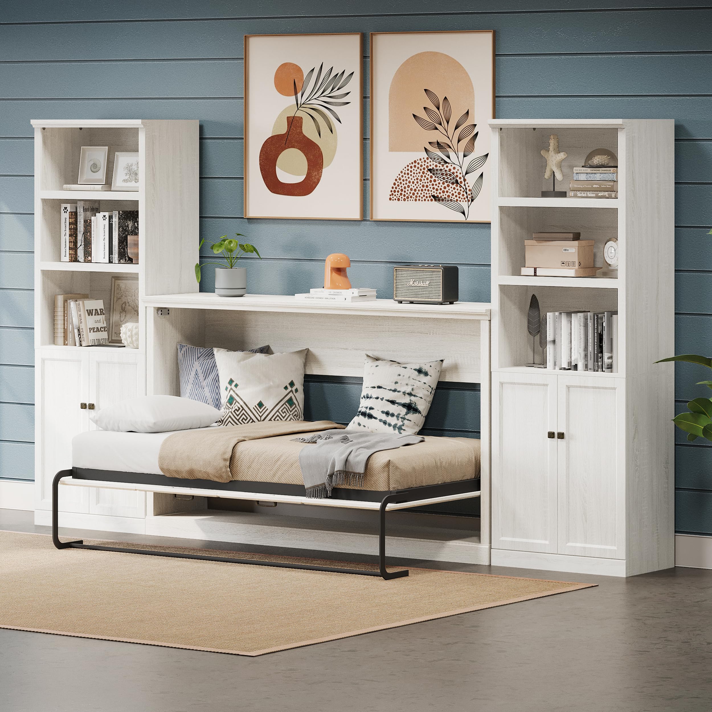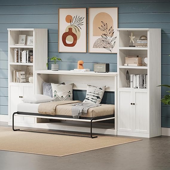 - Wall Bed with Storage Shelves: Featuring a bookshelf on both sides, with three tiers of open shelving and a lower cabinet, this murphy bed provide more space for you to store home items. Designed with integrated USB ports, ideal for charging electronic devices such as alarms or smartphones, ensuring they are always within reach.