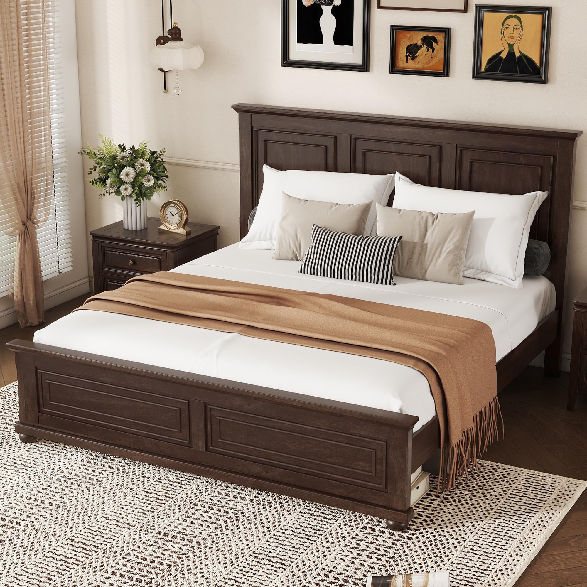 King Size Platform Bed with Tall Headboard & Footboard, Pinewood King Bed Frame