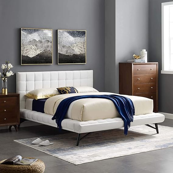 - TUFTED QUEEN PLATFORM BED - Inspired by mid-century elegance, this queen bed is an elegant backdrop for a master bedroom or guest suite. Biscuit tufting and soft texture elevate bedroom décor