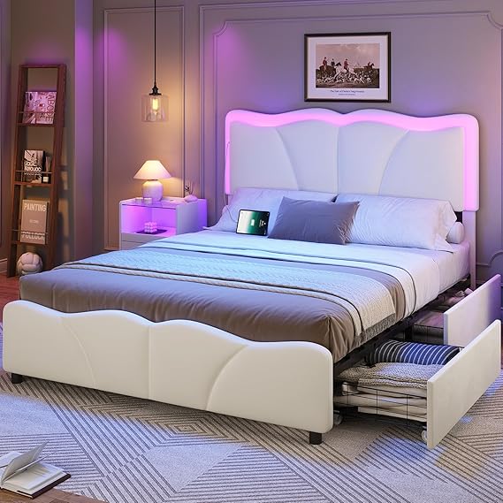 - Immerse yourself in captivating atmospheres with the built-in RGB lights, offering over 60000 vibrant colors, 0-100 level brightness and speed adjustment, 29 dynamic modes and mic/timing functions all at your fingertips with the included remote control or APP. Built-in 1 Type-C and 1 USB port in the headboard compatible with Android and iPhone, provide convenience for charging your mobile devices such as phones, earphones, tablets and Kindles.