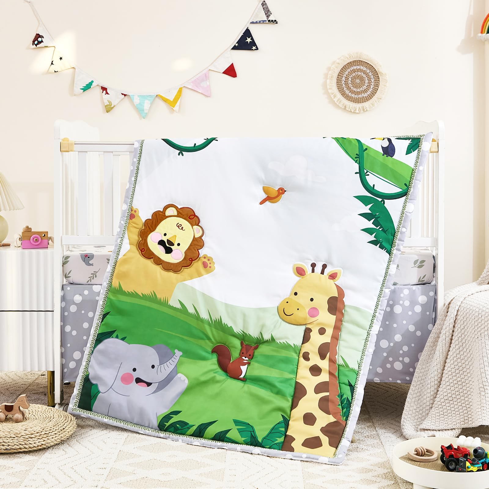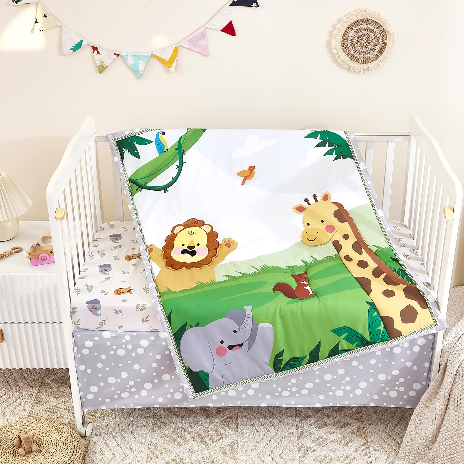 NacoMoco 3-Piece Crib Sets for Boys Girls - Ultra Soft Safari Crib Bedding Set Includes Crib Comforter, Sheet & Skirt (Happy Animals)