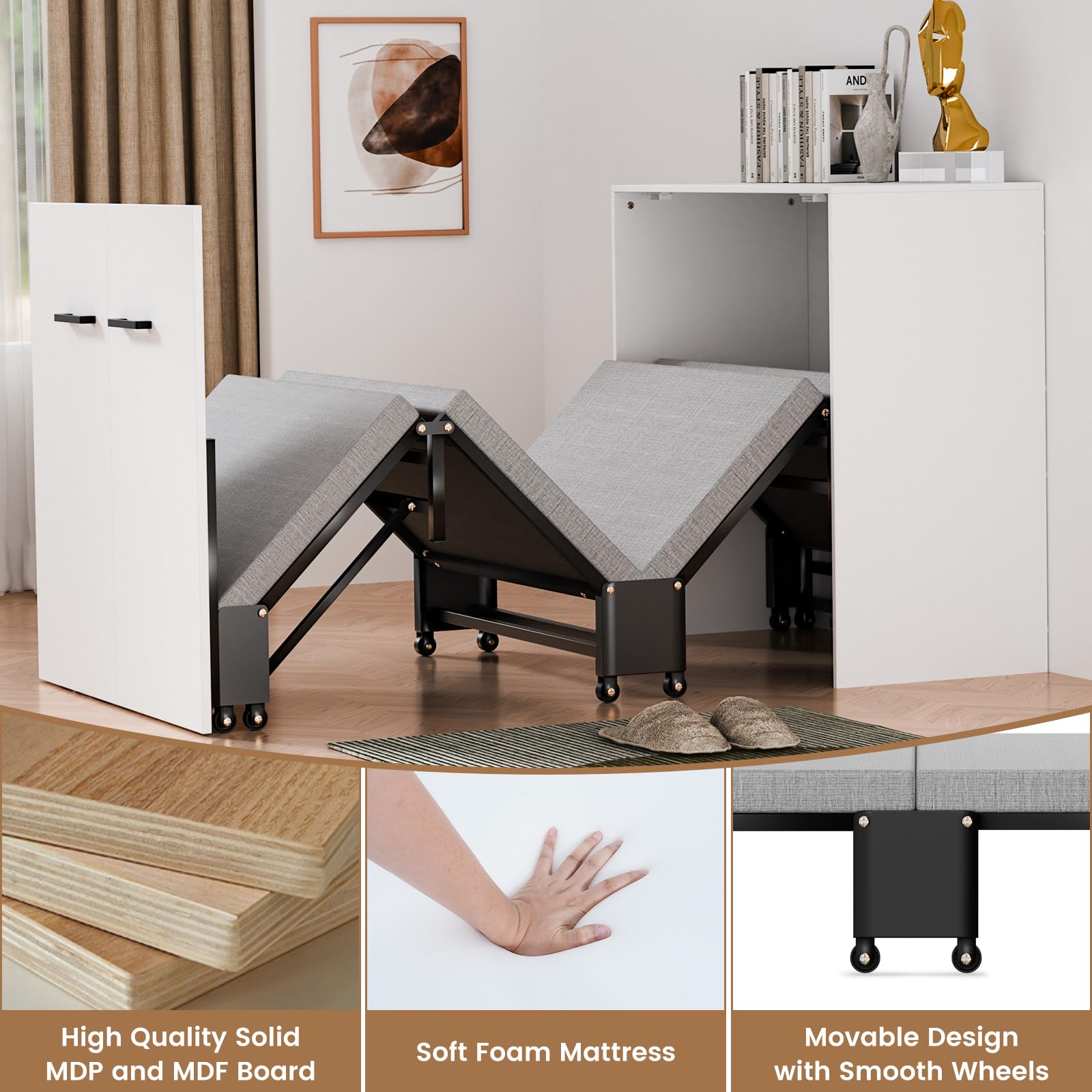 - Effortless Quick-Fold System: Transform your cabinet into a cozy bed in seconds—no tools needed. Just one smooth pull sets it up, and it folds back just as easily, snapping your space back to tidy in a flash. Life’s complicated enough; your furniture shouldn’t be