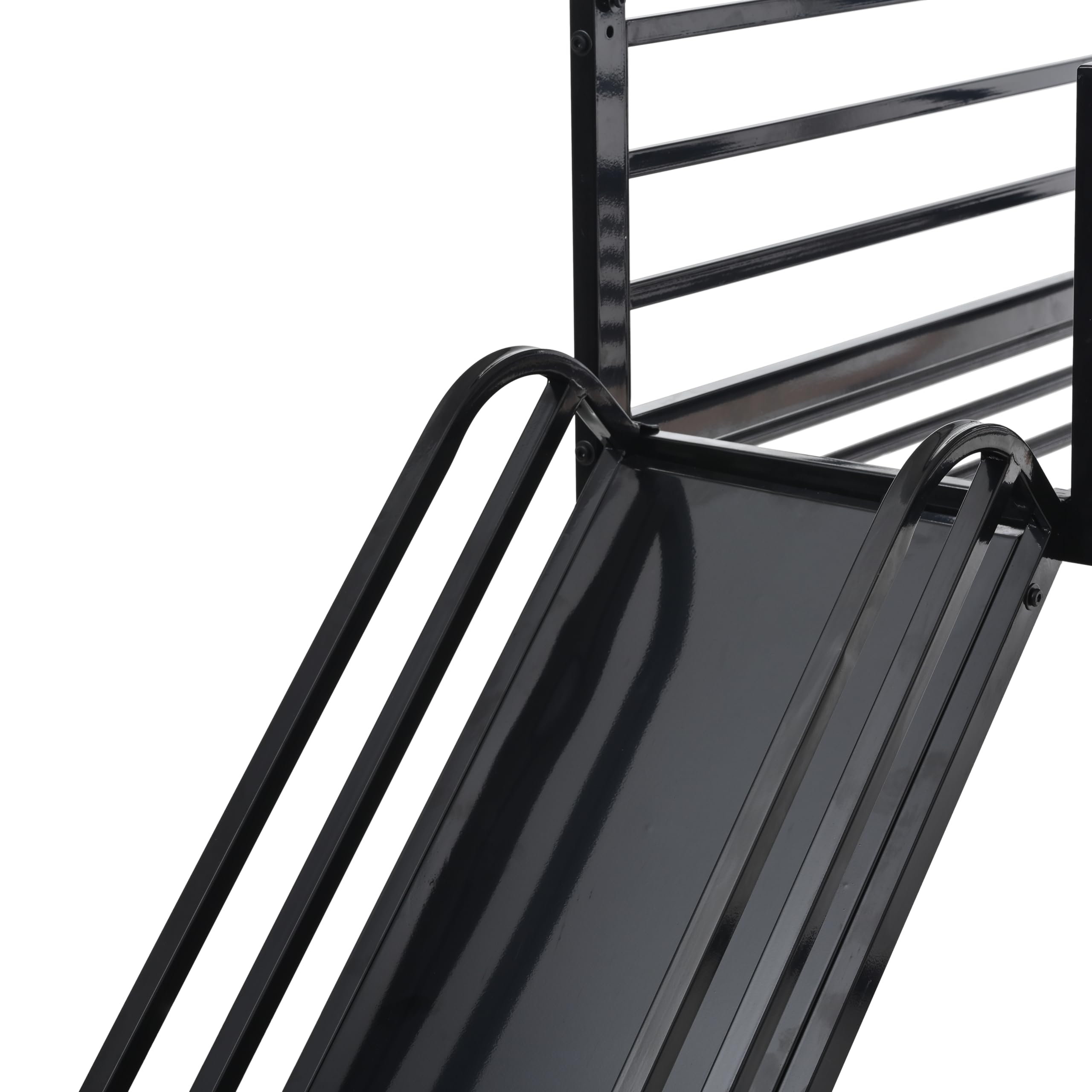 - Durable metal slats for strong load-bearing capacity, No box spring Needed. Equipped with a sturdy 3 step ladder and a slide for easy access to the top bunk which can be put on left or right depends on yourself. Weight limit: 220 pounds.