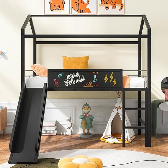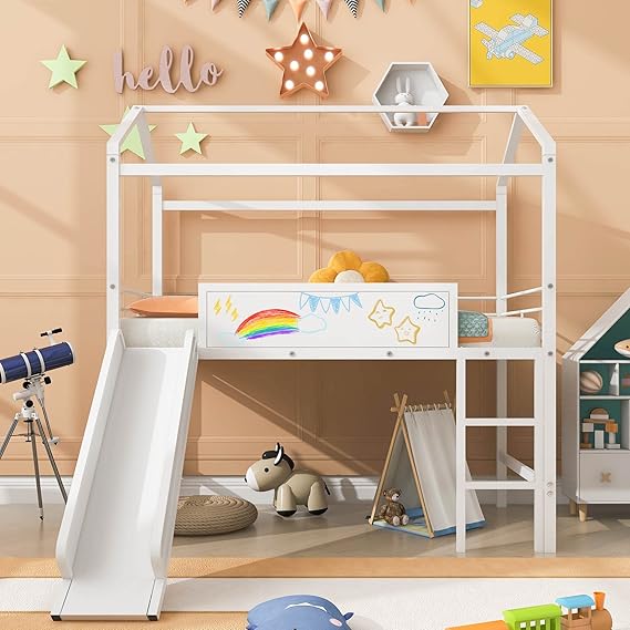- Cute house beds with slide crafted with a whimsical playhouse design,comes with slide,this twin size bunk bed frame with offers a comfortable and exhilarating experience during both sleep and playtime that will let their imaginations run wild. Bunk bed with slide, bunk bed twin over twin, bunk bed with slide and angled ladder