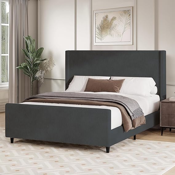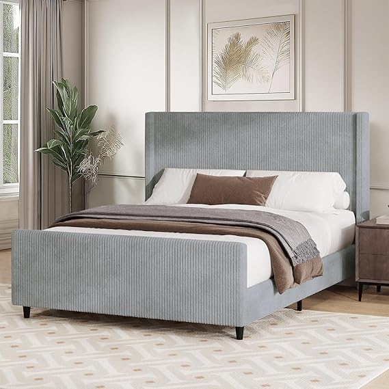 - Exquisite Queen Bed Frame: Our modern minimalist upholstered queen bed frame, crafted with a luxurious corduroy design, exudes timeless charm. The classic high headboard, seamlessly combined with a wingback, creates a look that complements any decor style, be it minimalist, eclectic, modern, or classic. Sink into the sumptuous comfort of this queen size bed and enjoy a night of truly luxurious rest