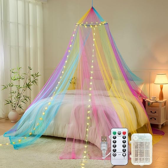 Rainbow Bed Canopy for Girls, Princess Canopy Bed Curtains with 24 Colors Star Lights