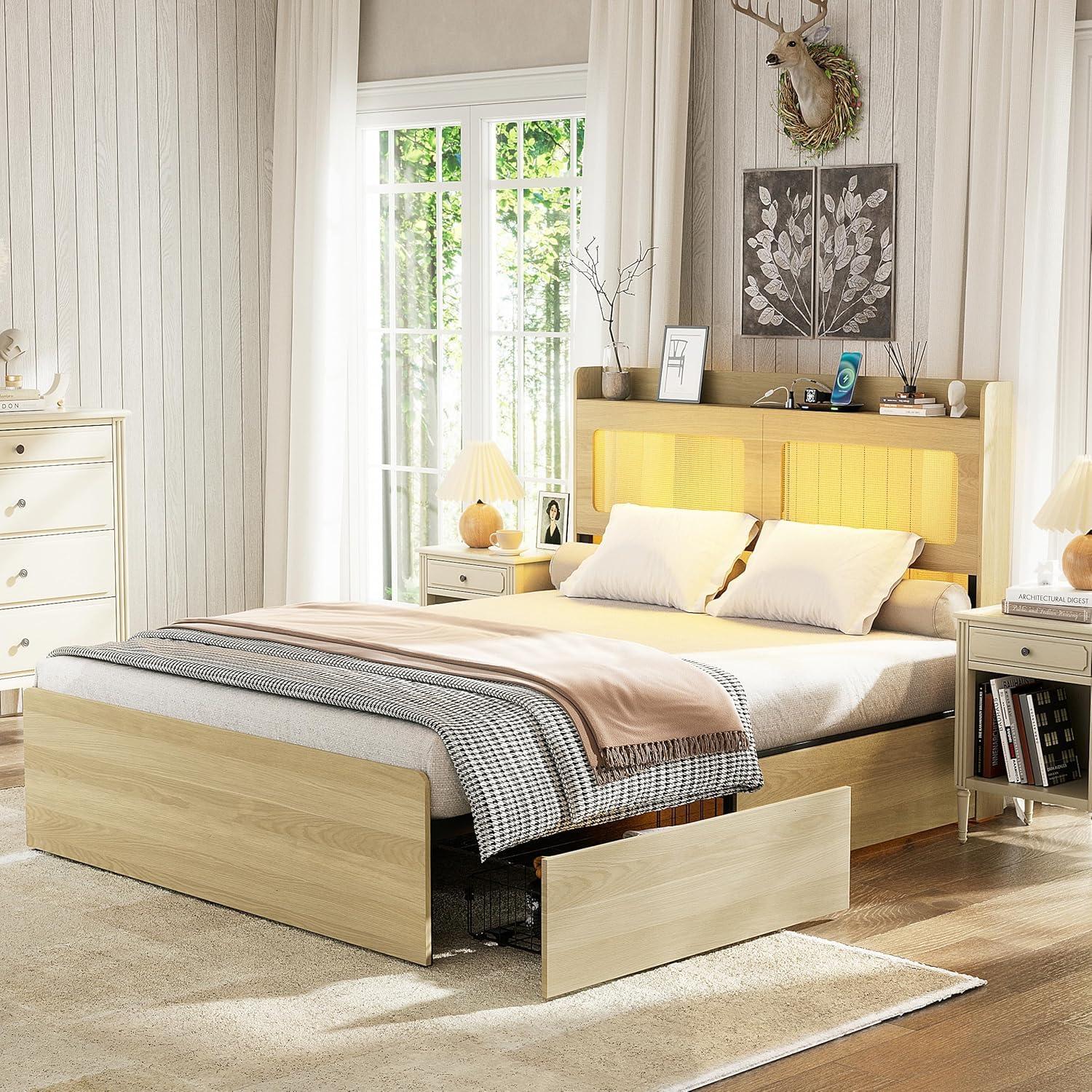Natural Rattan Queen Bed Frame with Colorful LED Light