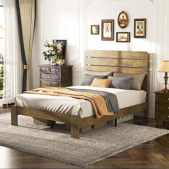 - The rustic bed frame with wooden headboard has a unique and innovative design of the entire headboard, which adopts an open horizontal bar design and the wood grain pattern adds a natural flavor. The headboard is high enough to allow your head and body to relax enough when you lie down.