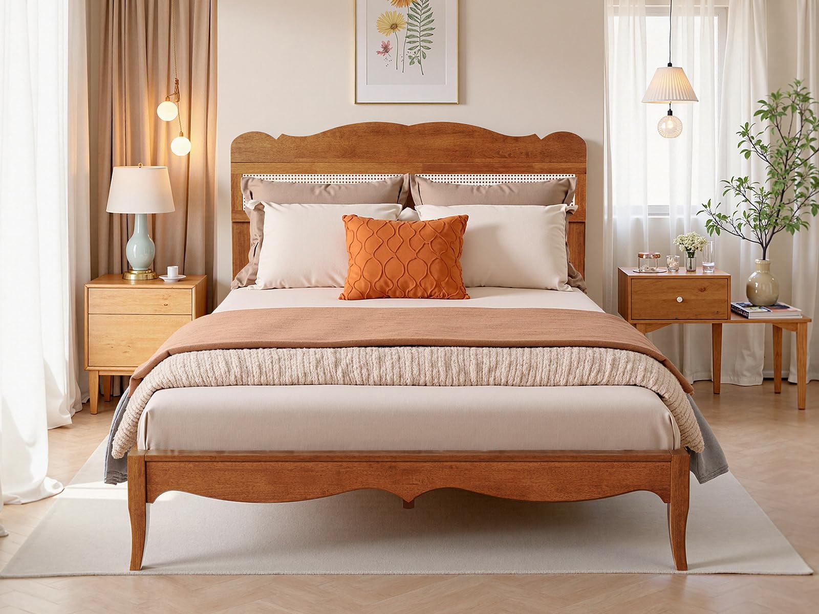 Rattan Queen Bed Frame with Headboard, Mid Century Wood Bed Frame