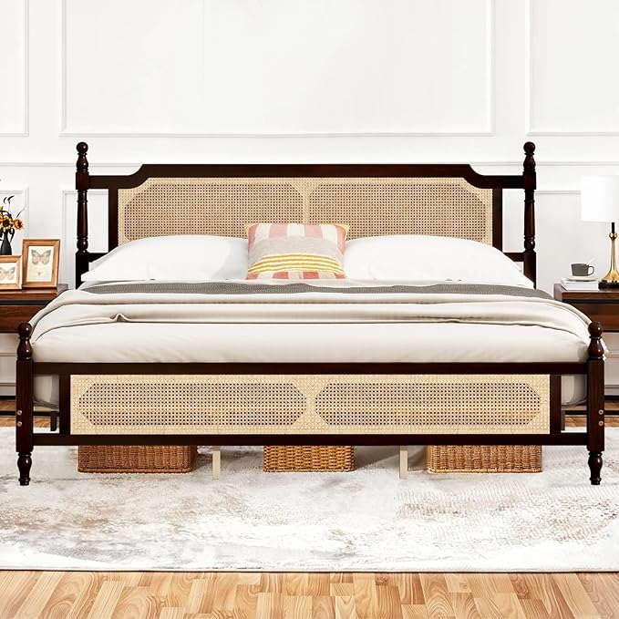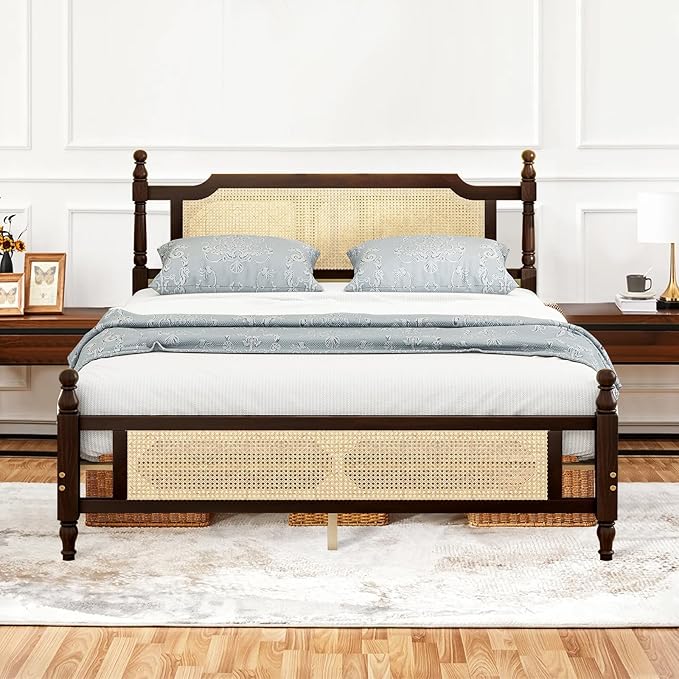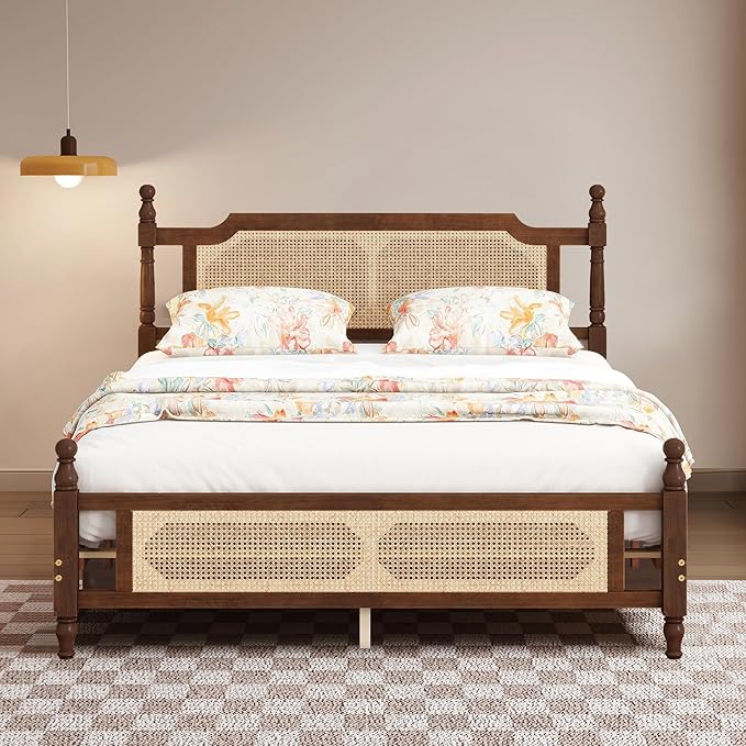 - Crafted from premium Pine hardwood for durability, this queen bed frame features a stylish woven rattan headboard, adding a natural, boho-chic touch to your farmhouse, modern, or coastal bedroom decor. The sturdy construction ensures long-lasting support while enhancing your room’s aesthetic.