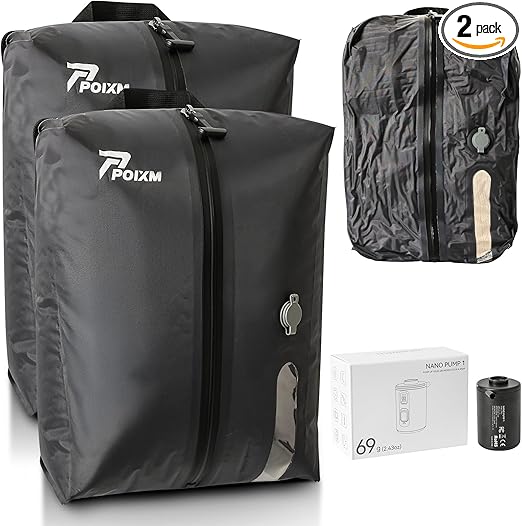 - POIXM vacuum travel bags feature an advanced one-way valve design, enabling fast compression with our vacuum pump or easy air expulsion by rolling or hand-squeezing. The high-efficiency vacuum system reduces soft items like down jackets by over 80%, maximizing storage in your suitcase or closet.