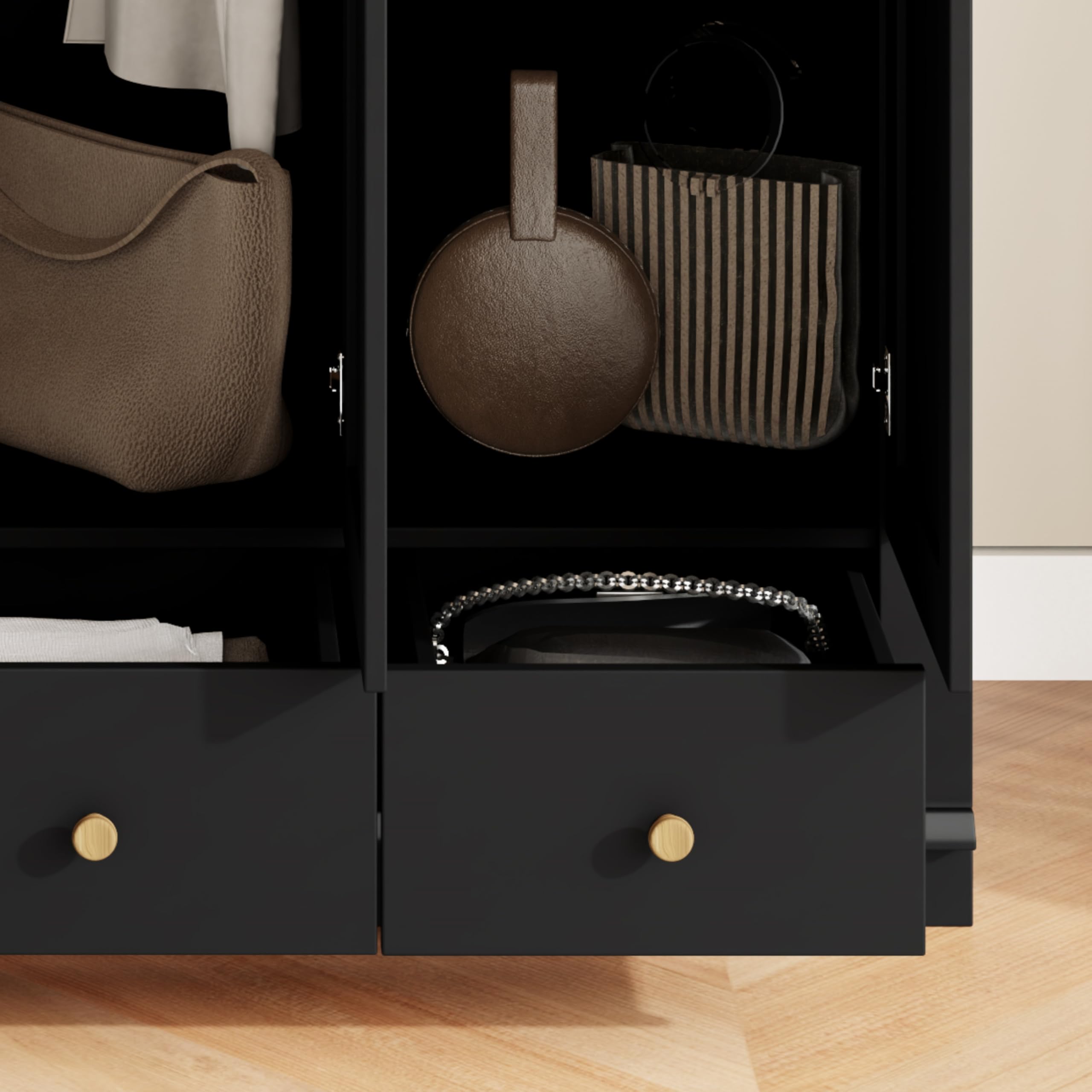 - Bottom Drawers for Extra Storage: This wardrobe features two spacious bottom drawers, offering additional storage for shoes, bags, linens, and smaller essentials. The smooth-gliding drawers enhance accessibility while keeping your wardrobe neat and tidy, making organization effortless.