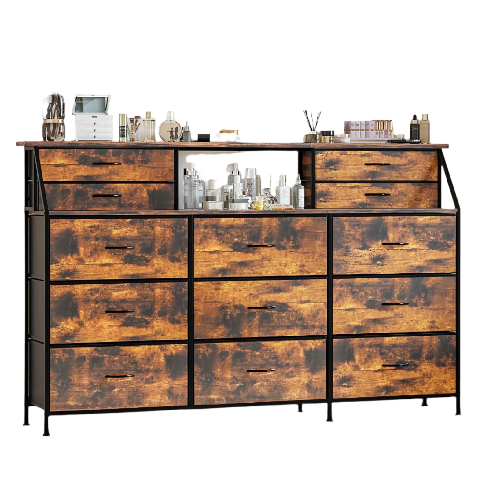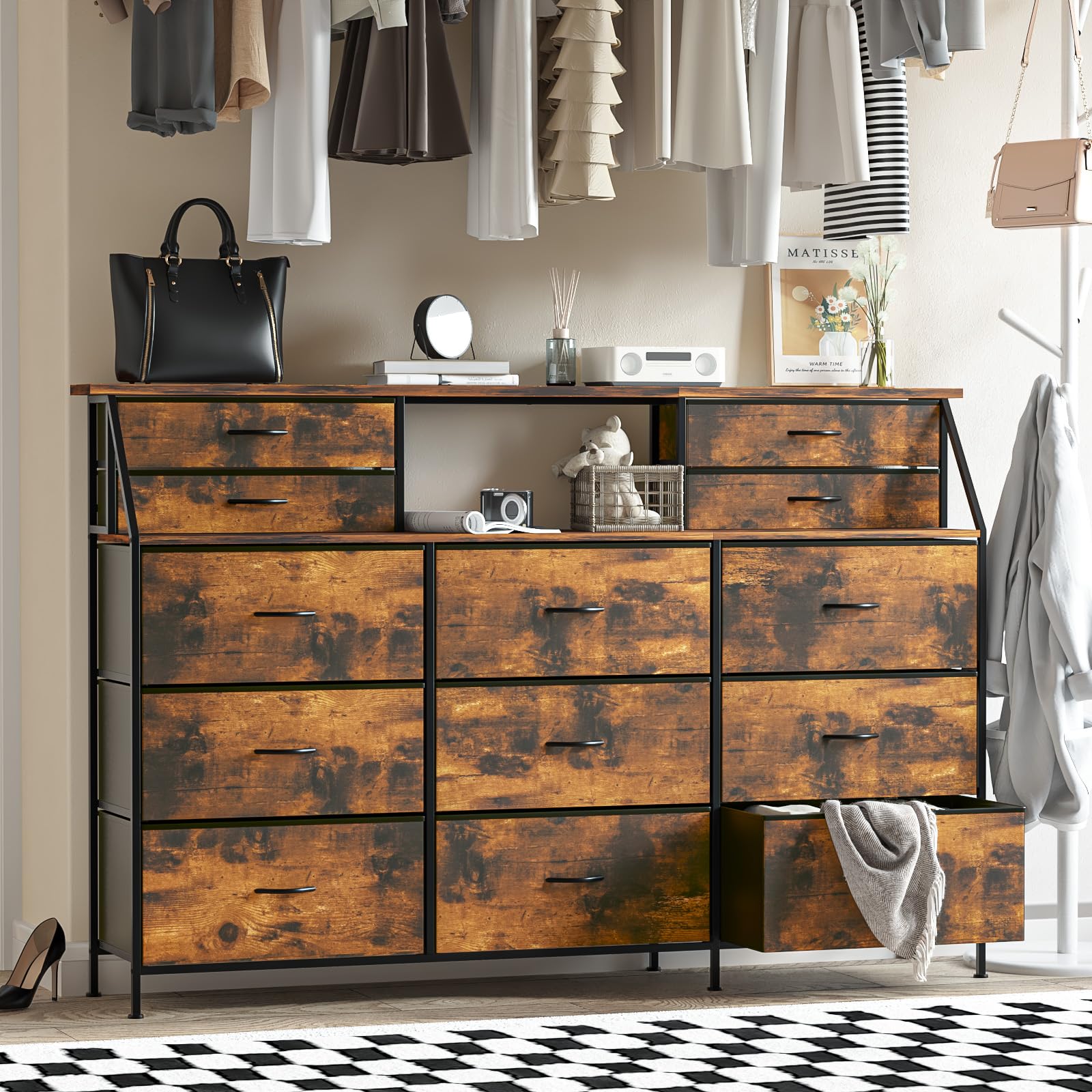 - 13 Fabric Drawers Large Capacity Storage Space:The dresser for the bedroom features 4 medium drawers and 9 large drawers, which are designed deeper and more spacious than typical fabric drawers, making it easy for you to categorize and store all kinds of items to meet your various storage needs.The 9 larger drawers at the bottom provide ample space for clothing storage, while the 4 medium drawers at the top are perfect for accessories and jewelry