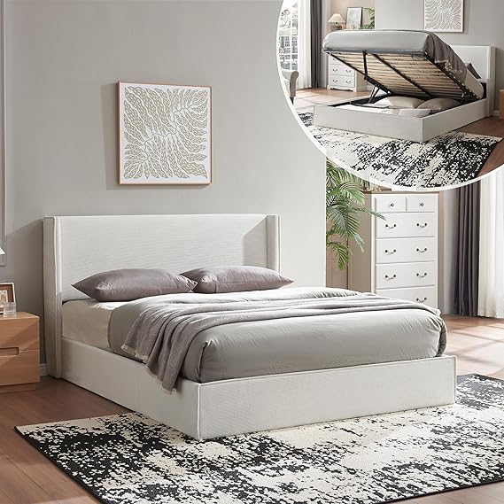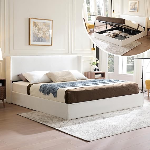 - Spacious Underneath Storage: Our hydraulic bed frame king features a hydraulic lift system that easily raises, revealing an 8.46" deep storage compartment; This bed with storage underneath provides ample space for storing extra bedding, clothing, shoes, and other items, making it ideal for small bedrooms or apartments where storage space is limited