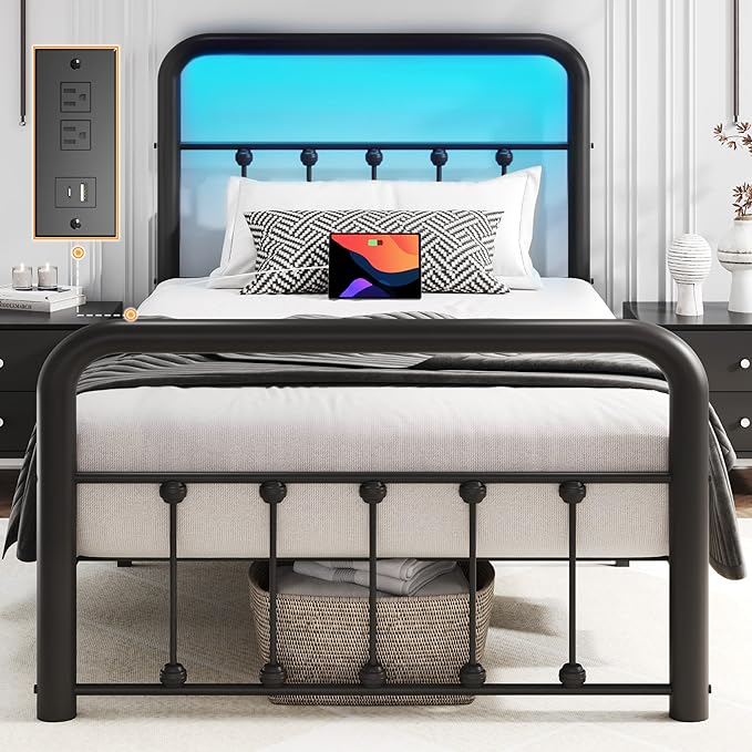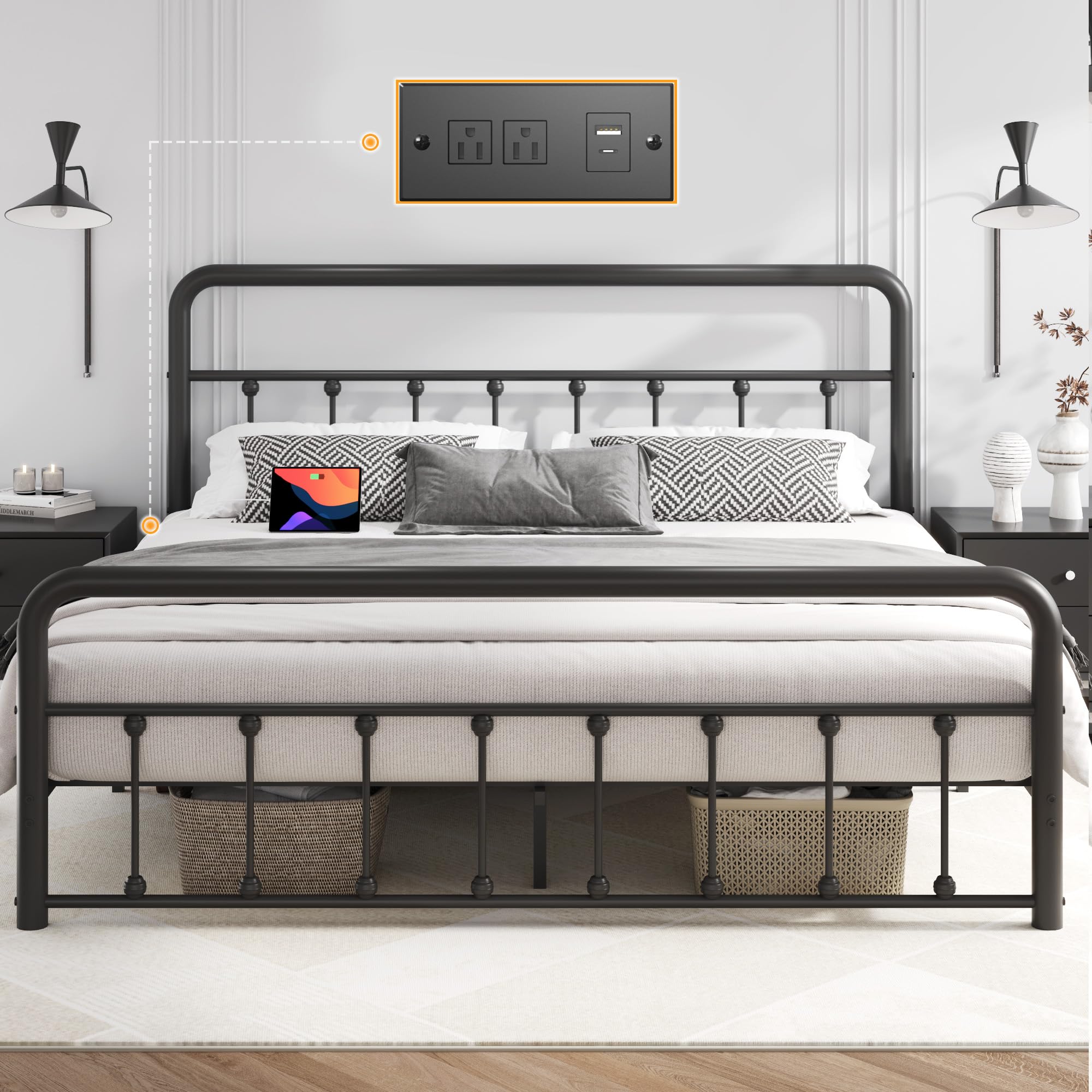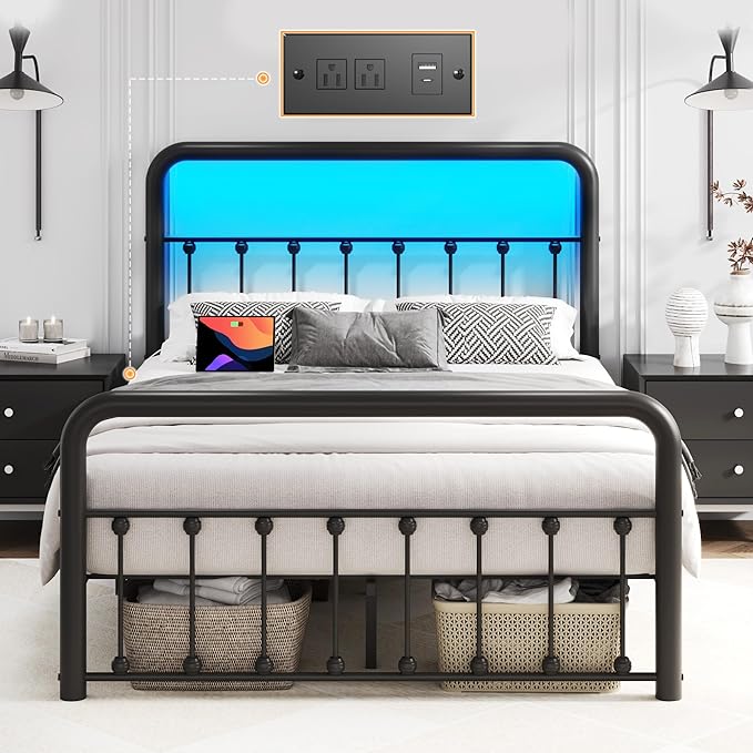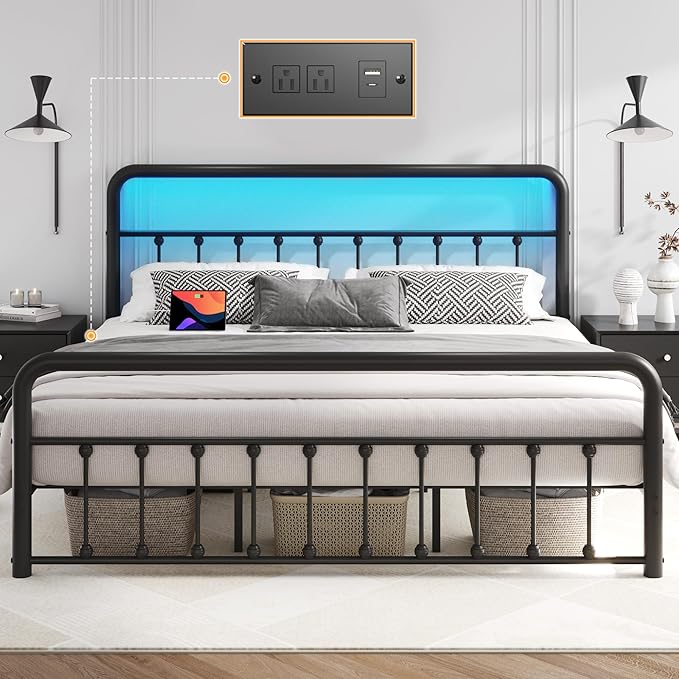 Queen Bed Frame Classic Metal Platform Bed Frame with Charging Station & LED