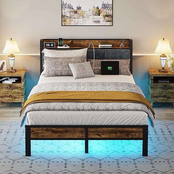 Bed Frame with Headboard, Metal Platform Bed with Smart LED Lights