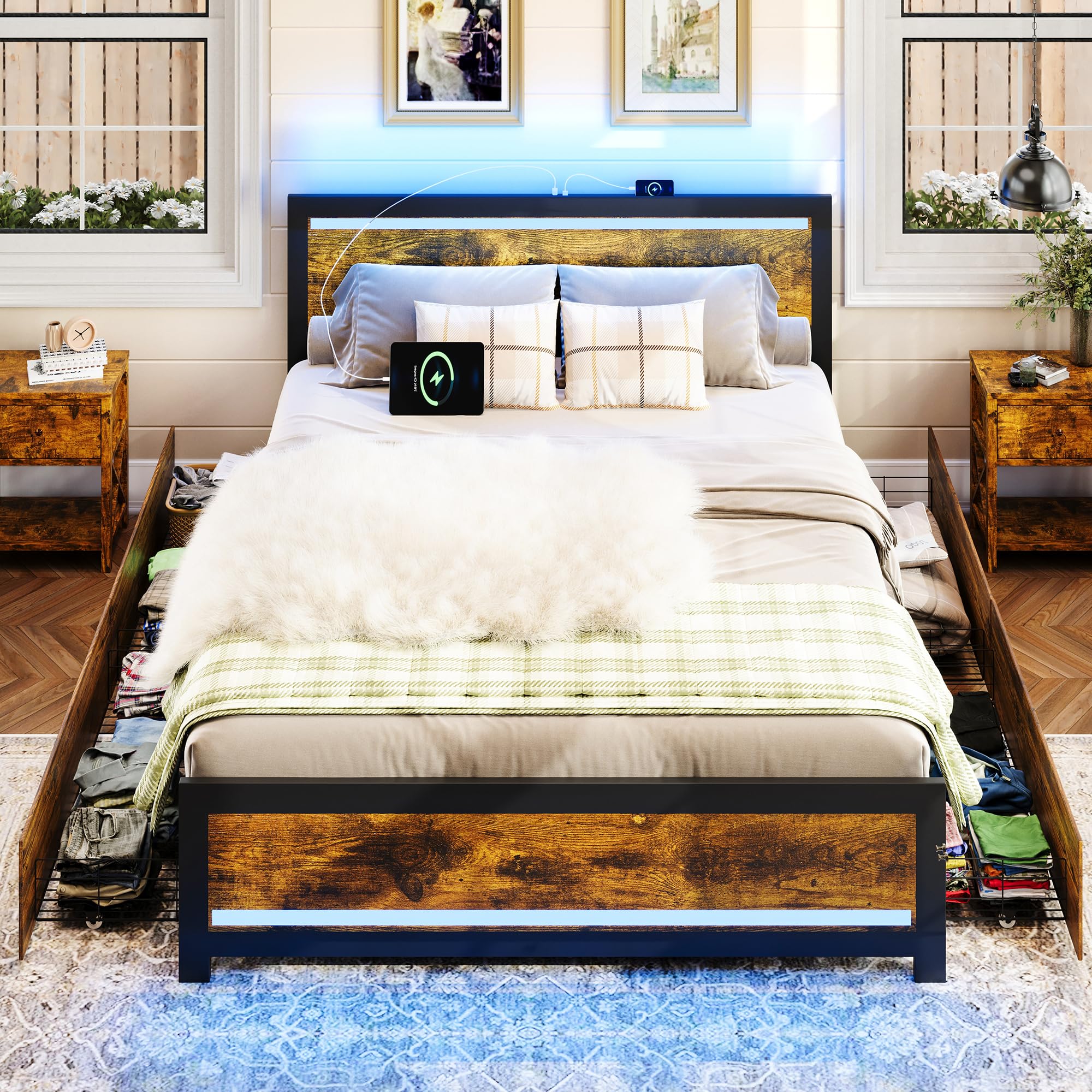 - Thoughtful Designs for Easy Charging, thanks to the 2 built-in USB ports, your morning and evening routines just got a lot easier. Built-in USB ports make charging electronic devices such as phone, tablet or laptop within easy reach while you sleep.It would be much easier for you to use a book light to read when you are lying on this queen bed frame with headboard and storage