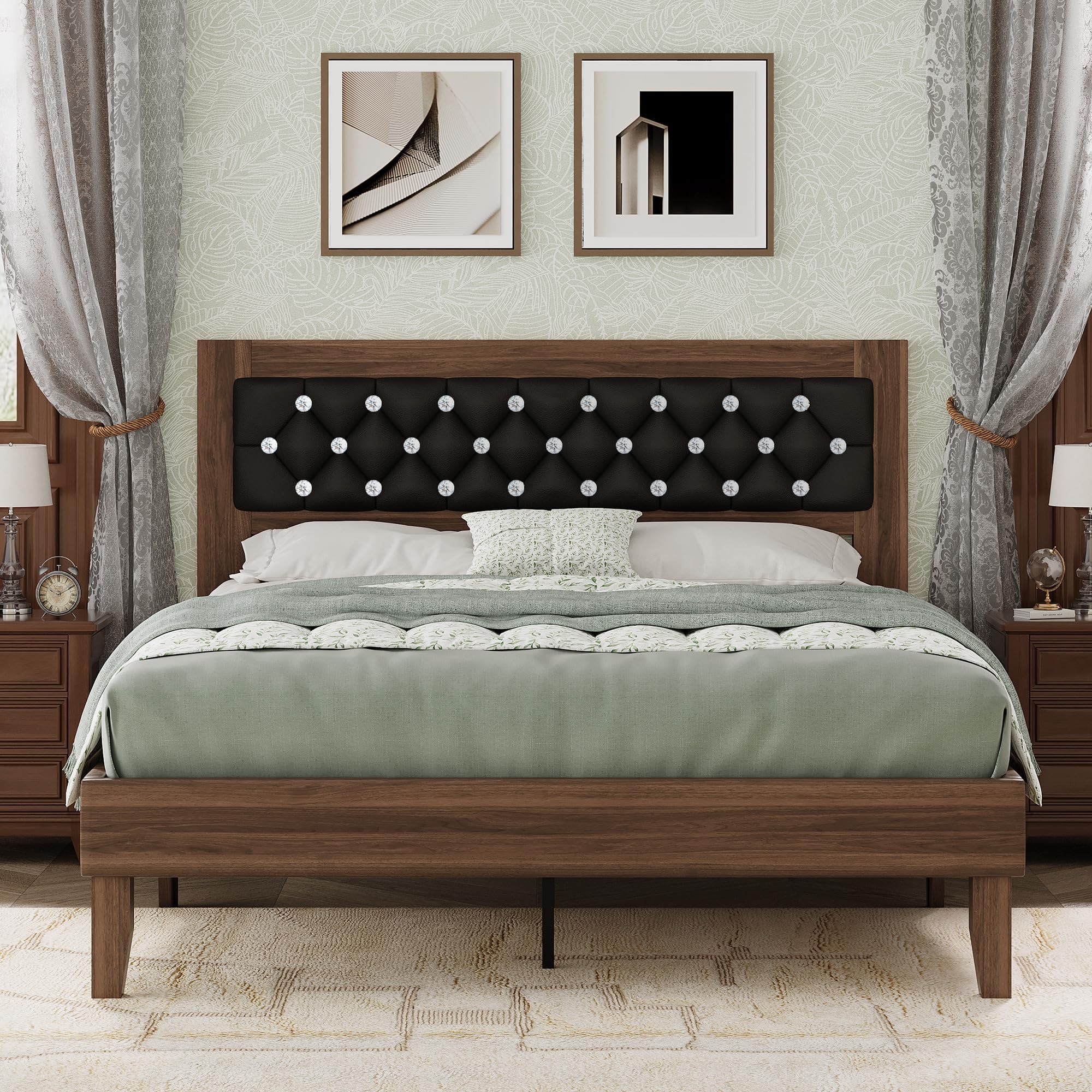 Queen Size Bed Frame, Wooden Platform Bed with Diamond Tufted Headboard