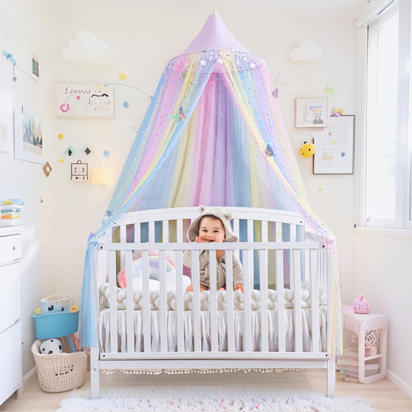 Rainbow Princess Bed Canopy for Girls, Glitter Star and Moon Canopy Bed Curtains