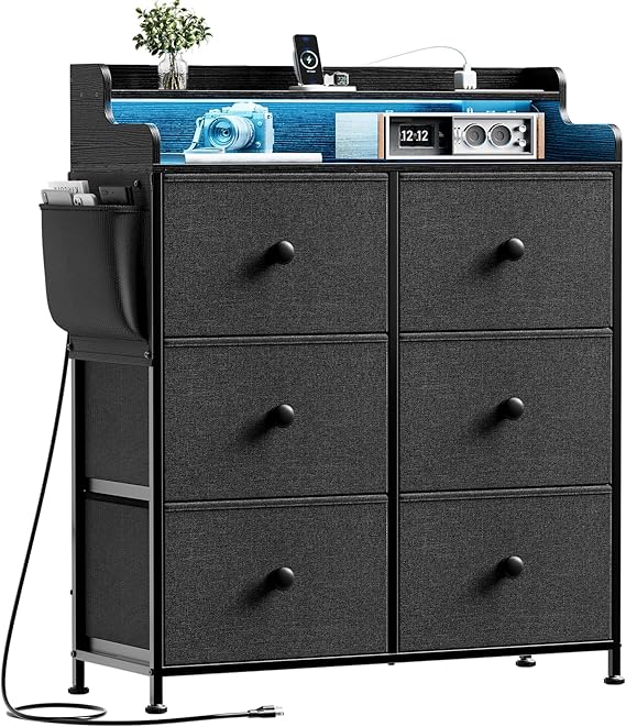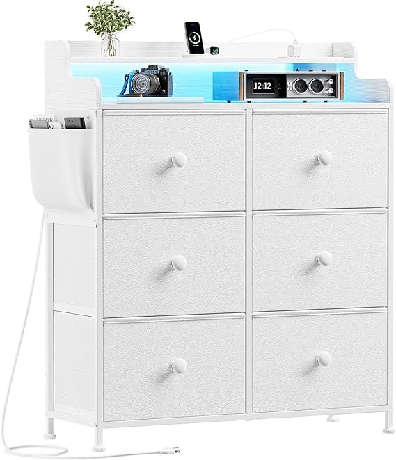 - Unique Design: REAHOME dresser Equipped with a built-in power outlet and LED light, this dresser combines functionality and style. Built-in power outlets (2AC+2USB+1TC), allowing you to easily charge your devices without the need for extra extension cords. With over 60,000 DIY colors to choose from, allows you to control 21 dynamic modes, 8 speed modes, and 8 brightness modes. follow your mood meet your needs