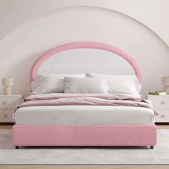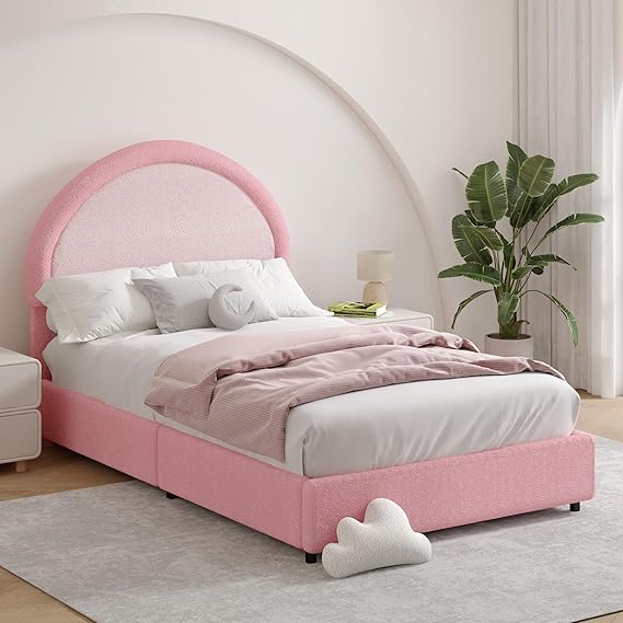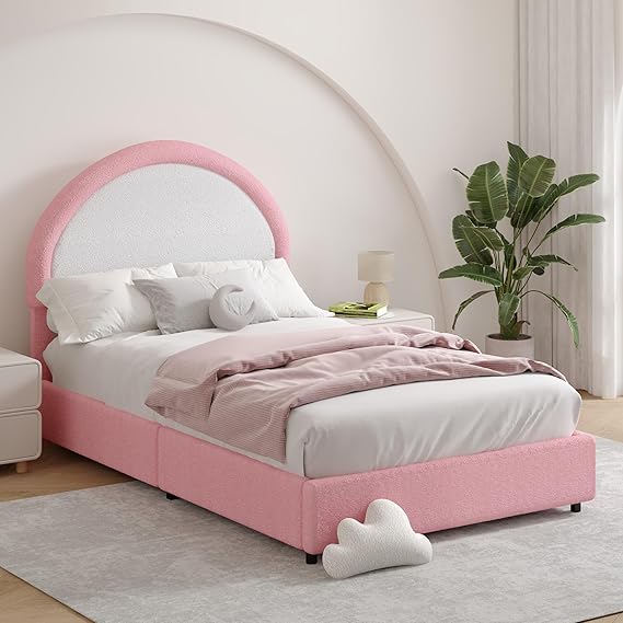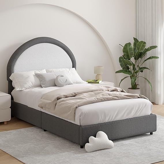 Twin Size Bed Frame, Boucle Upholstered Platform Bed with Headboard