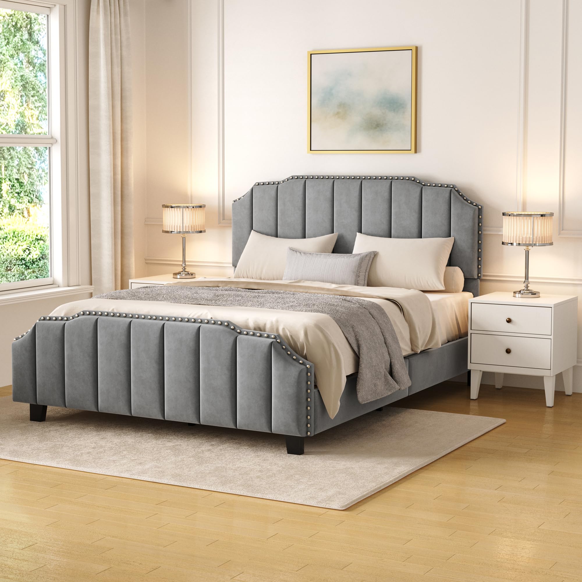 - Elegant Arched Silhouette: This upholstered bed frame is designed with soft arched top and vertical tufting, bringing height and elegance to your room. Nailhead trim outlines both headboard and footboard highlighting their shape.