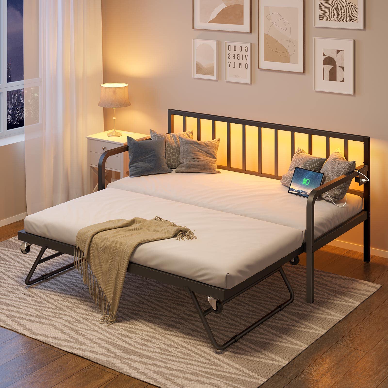 Daybed with Charging Station and LED Lights, Height Adjustable Twin Daybed