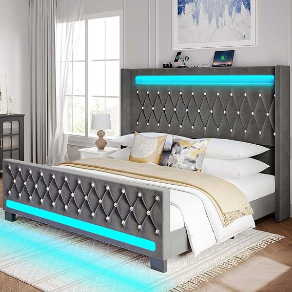 Queen Bed Frame with LED Light and Charging Station, Upholstered High Headboard