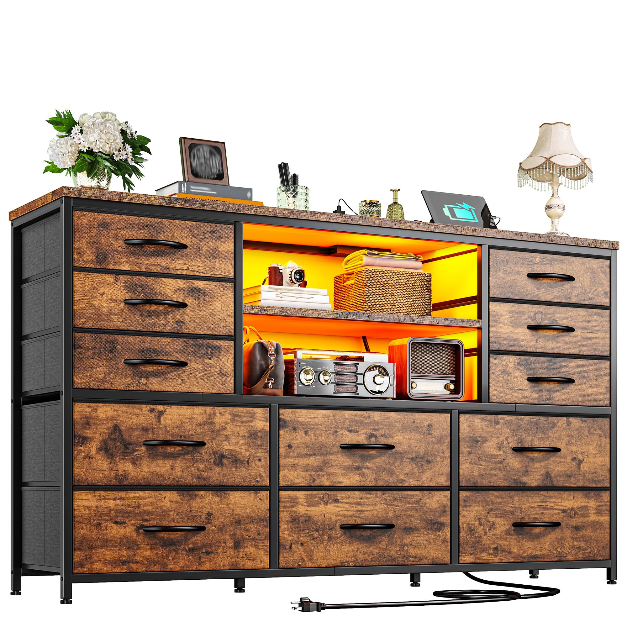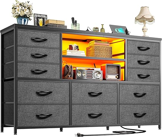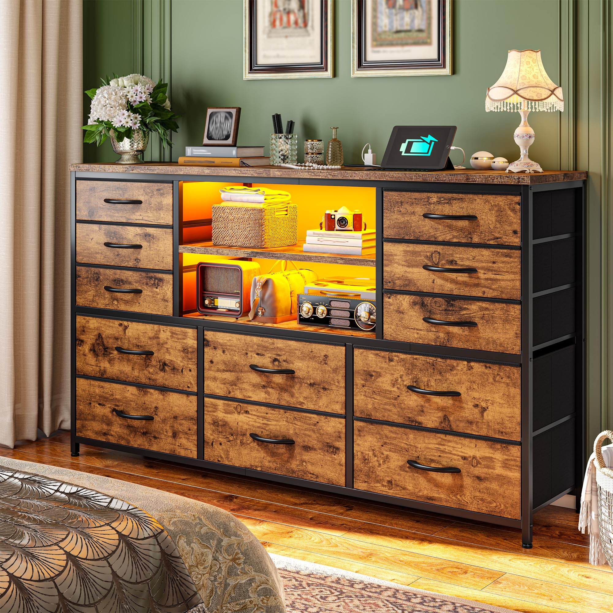 Dresser with Charging Station & LED Lights, Chest of Drawers with 12 Drawers for 55" TV