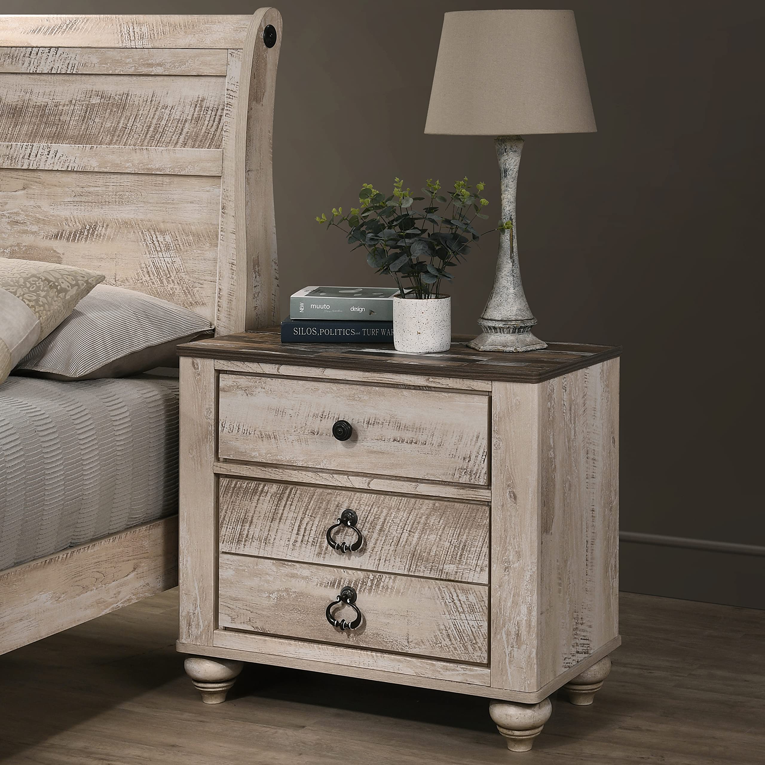 - This bedroom set in finished in a shabby-chic-inspired vintage white-washed finish with wood texture patterned tops, delicate metal ring and nob handles