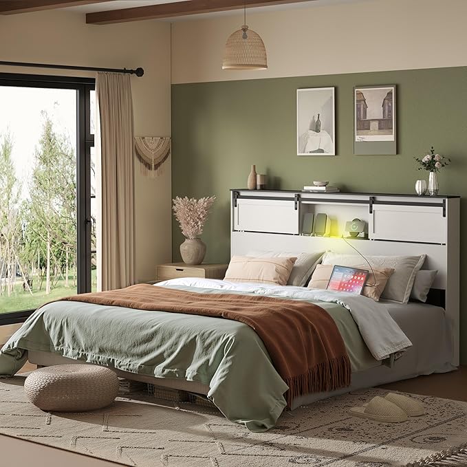 - Sliding Barn Door Storage Footboard: The queen size bed frame with storage at the footboard can store sheets, blankets or small toys, etc. Sliding barn door space-saving design, Exposed delicate metal rails and classic farmhouse-style elements combine to give you the ultimate in beauty