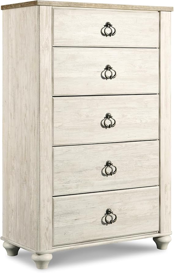 - WHITEWASHED FINISH: This white washed finished dresser exudes shabby chic styling that's fresh in any room of the home. Watch how this tall chest has presence and appeal