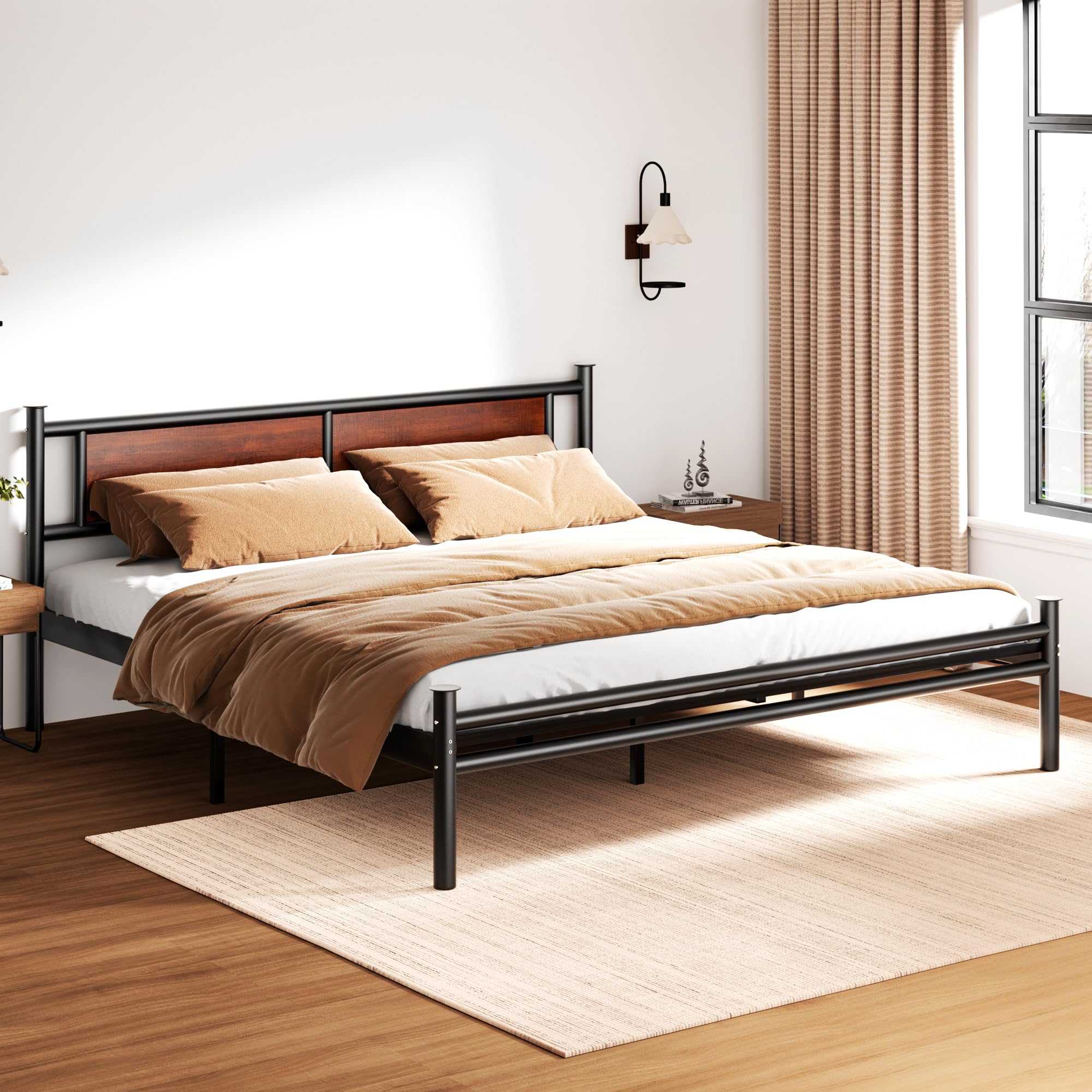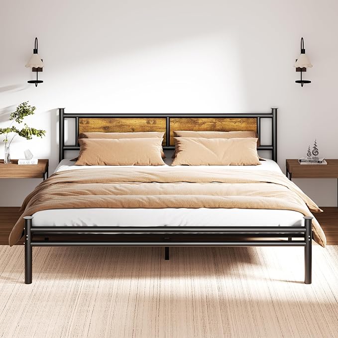 - INDUSTRIAL STYLE DESIGN: The iron bed is black painted for a rust-resistant finish and comes with a wood grain headboard. Creates a bold and striking look adding a minimalist vintage style to your room.