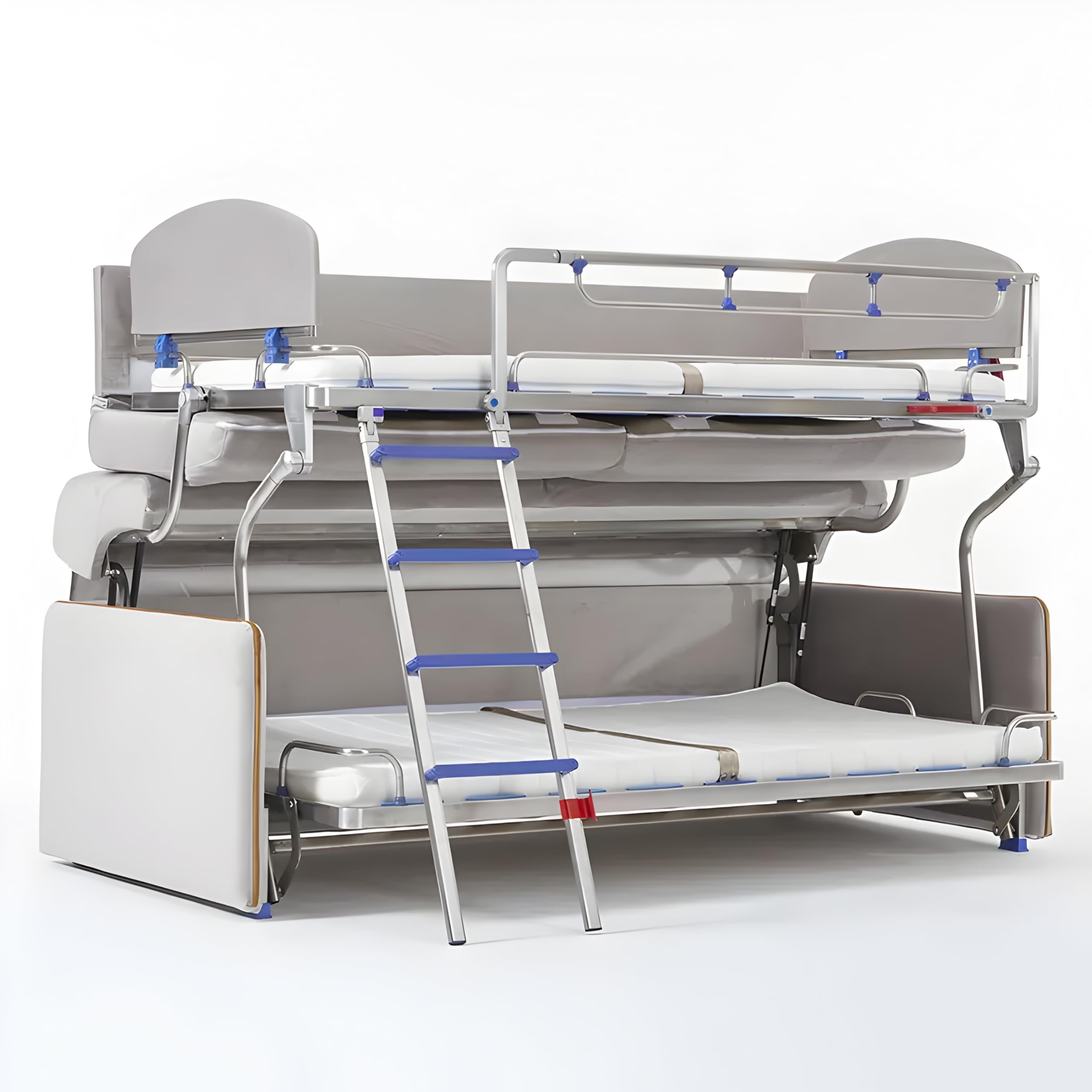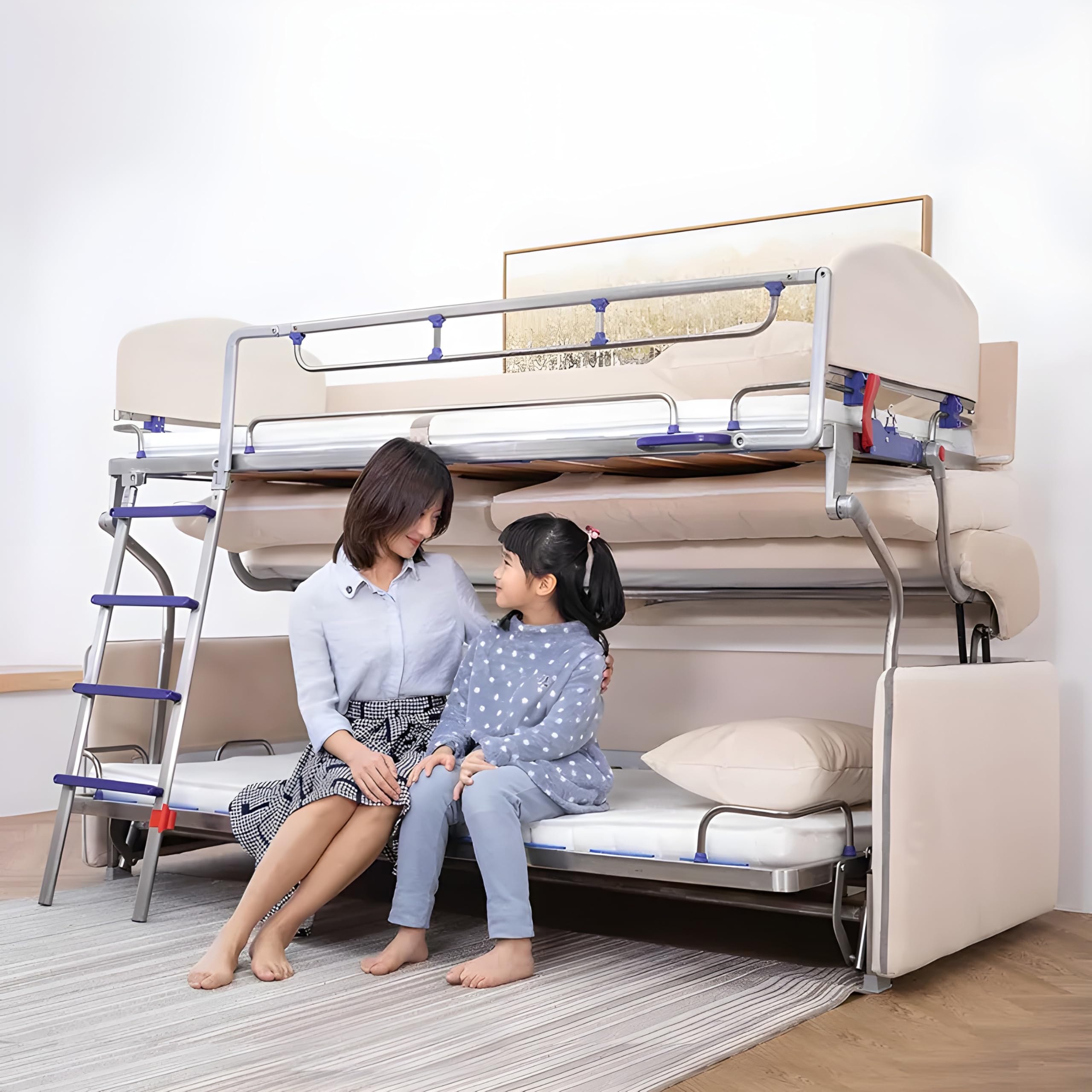 - Smooth Glide Mechanism with Discreet Strength The fold-out trundle base glides with precision, revealing a fully functional bunk setup with secure ladders and railings. Luxury meets simplicity in one fluid motion.