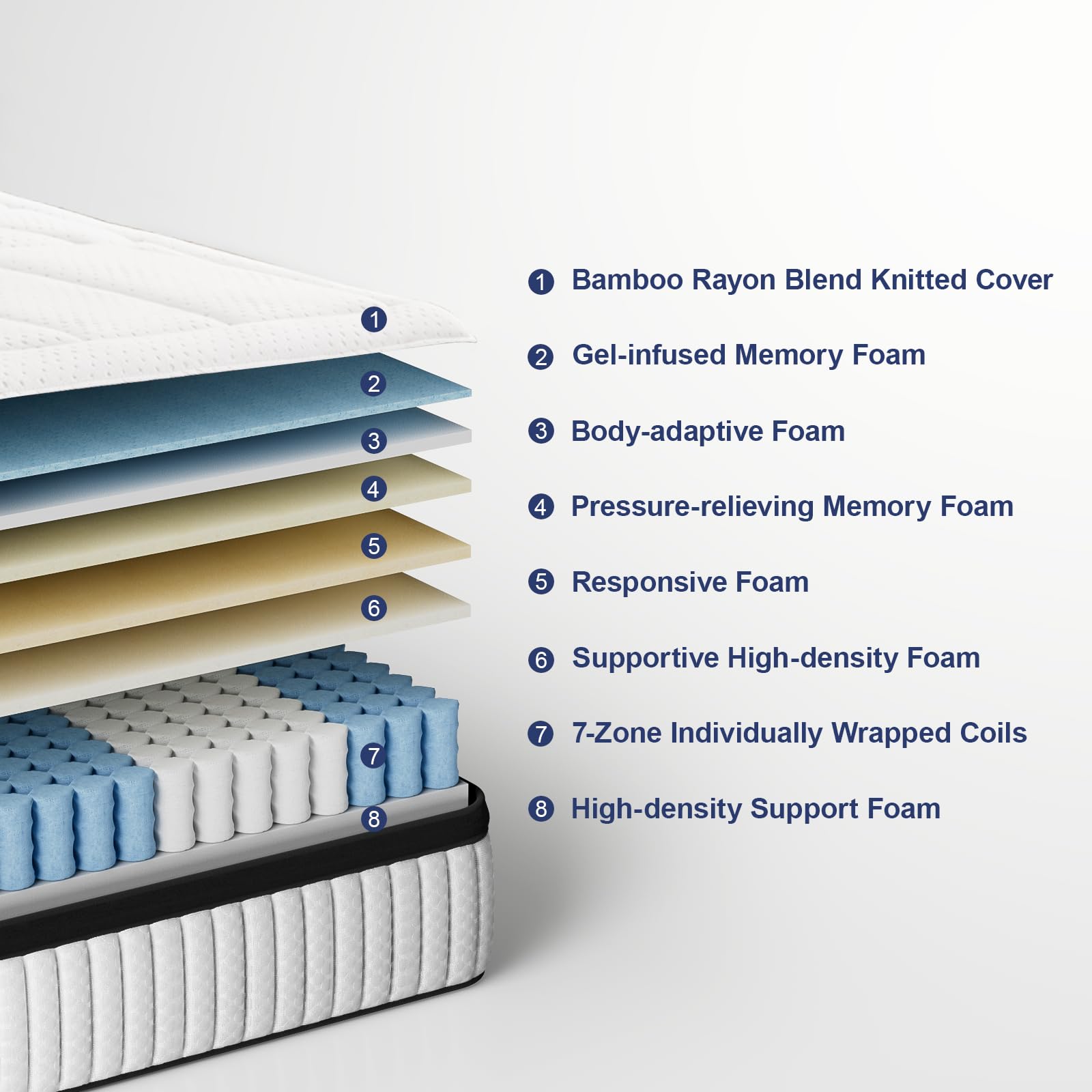 Suiforlun King Mattress, 14 Inch Hybrid Gel Memory Foam and Pocket Coils Innerspring, Euro Top Luxury King Bed Mattress with 7 Premium Layers, Pressure Relief, CertiPUR-US Certified, 80"x76"x14"