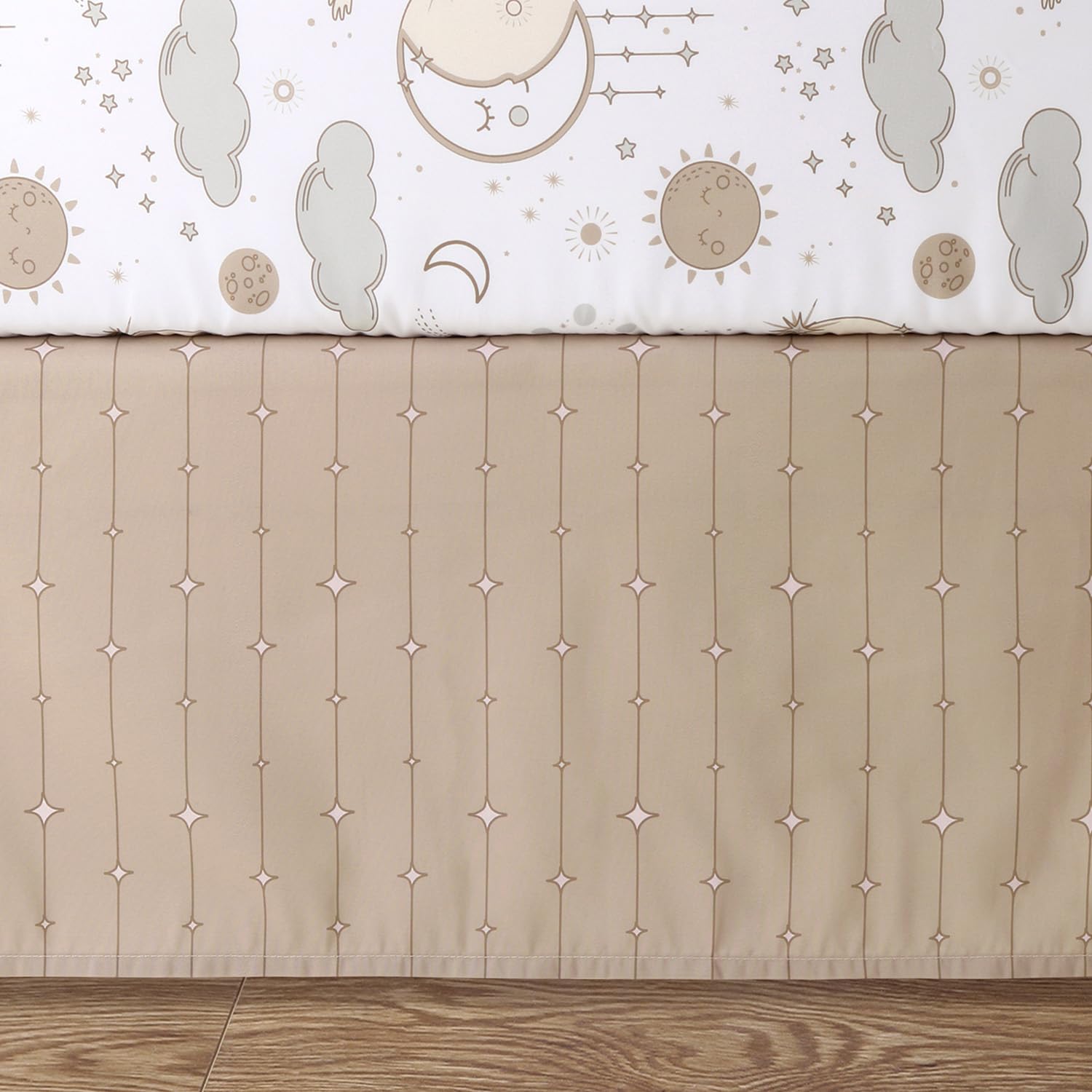 - Celestial Theme: Bring the excitement of starry skies to your toddler's or baby's nursery with a sleepy moon and sun on a beautifully designed crib quilt and baby crib sheets, combined with stars and clouds for a charming touch.