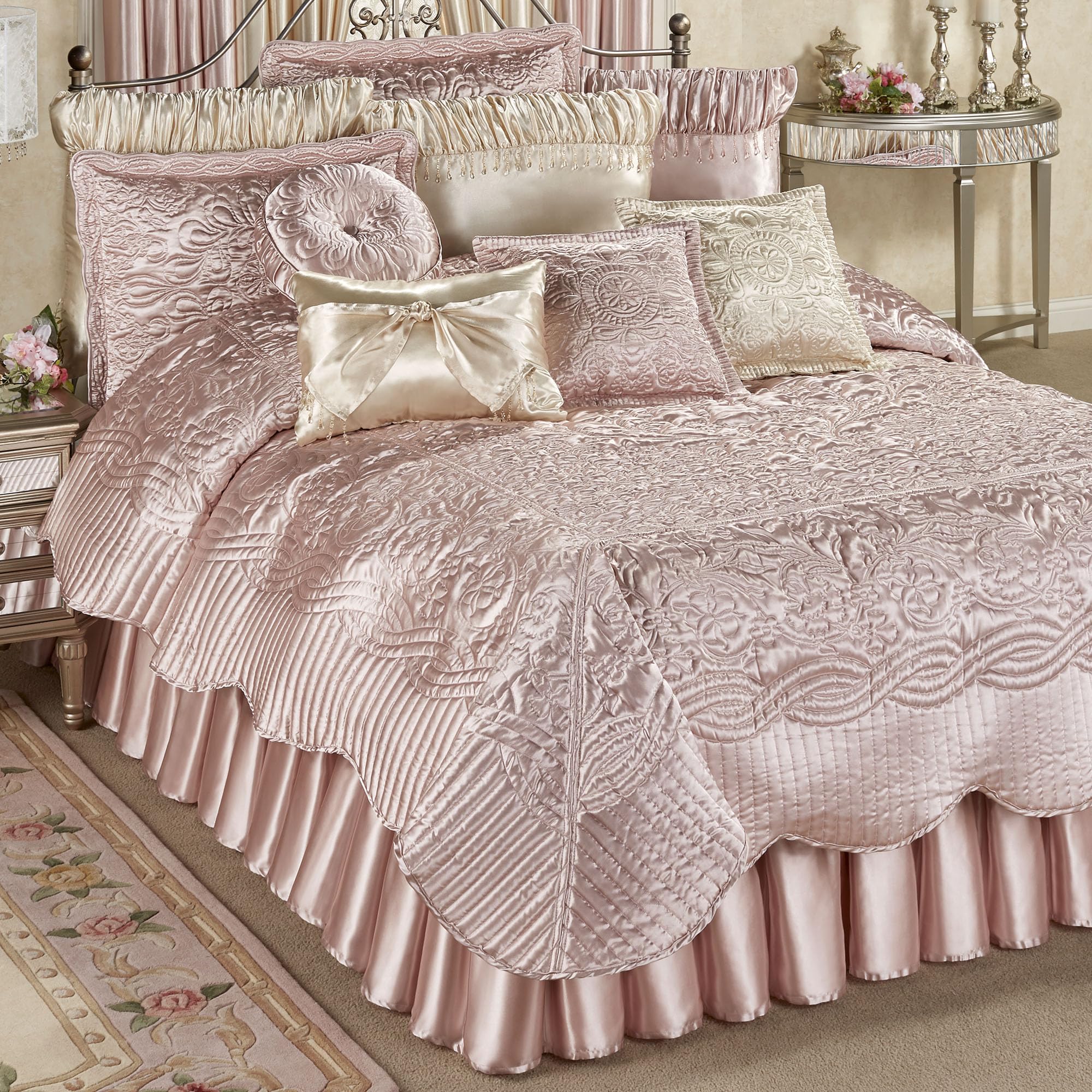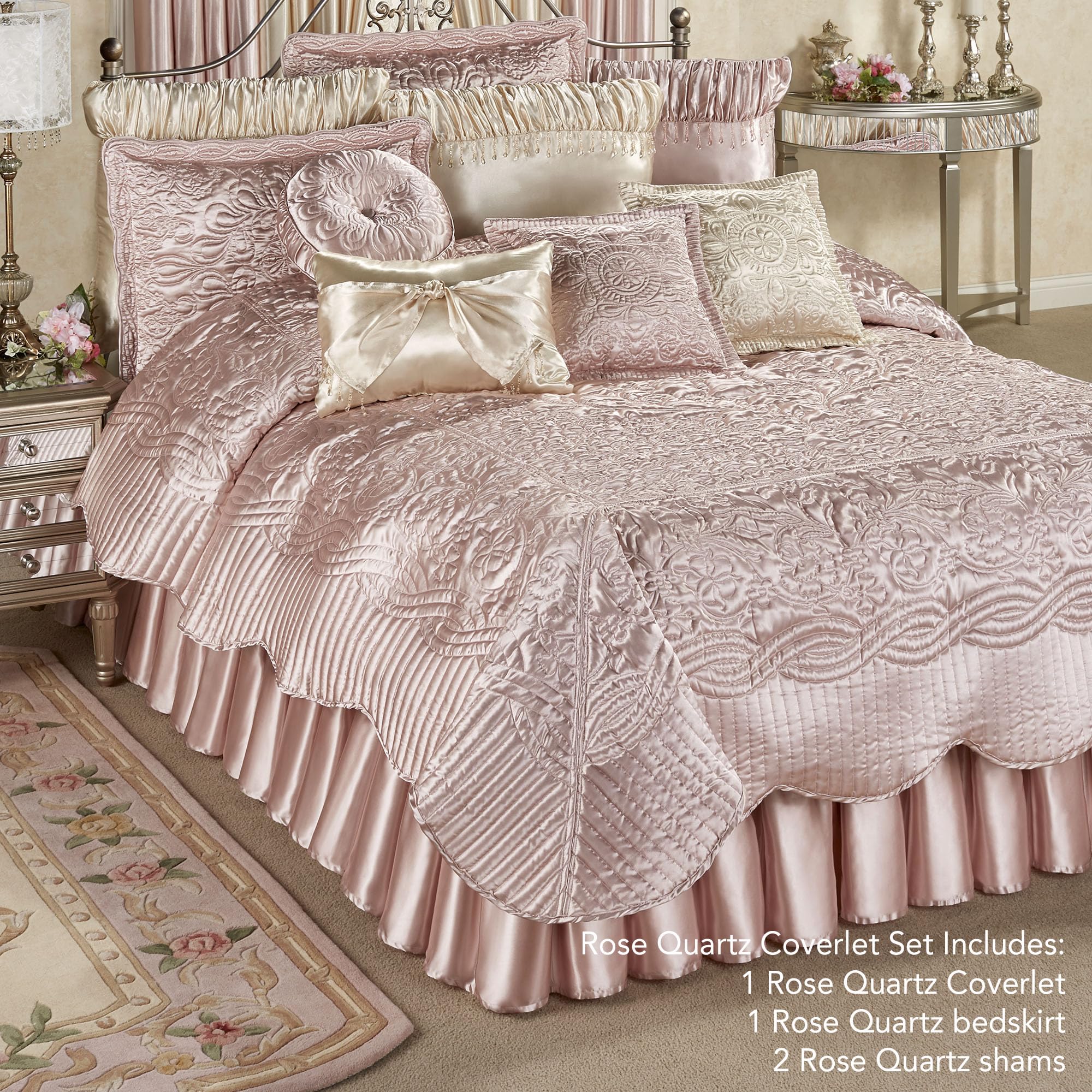 - Rose Quartz Coverlet Set includes coverlet, bedskirt, and shams
