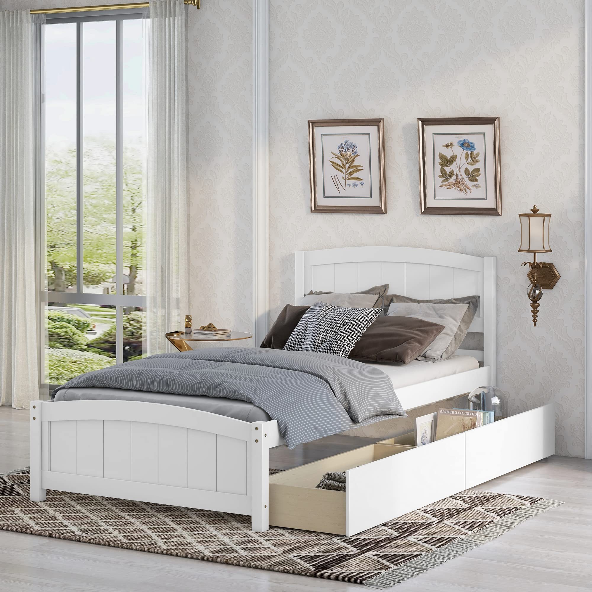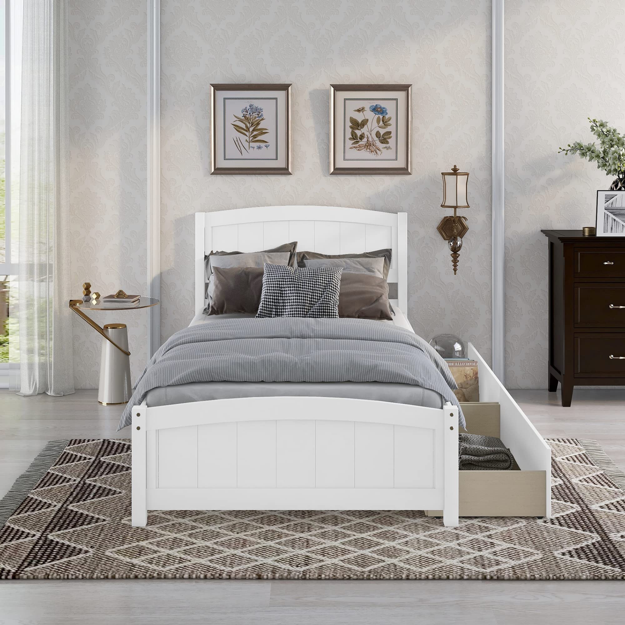 - Wood Platform bed with 2 big storage drawers, easy to pull out with casters, this twin platform bed is ideal for keeping your bedroom necessities such as bed sheets, pillows or blankets clean and tidy. Extra storage space is included opposite the drawer which is also great for placing your shoes or even traveling suitcases. Three baffles under the bed can prevent the drawers from running around.