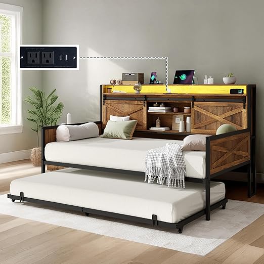 Daybed with Trundle, Farmhouse Daybed Frame with Sliding Barn Door