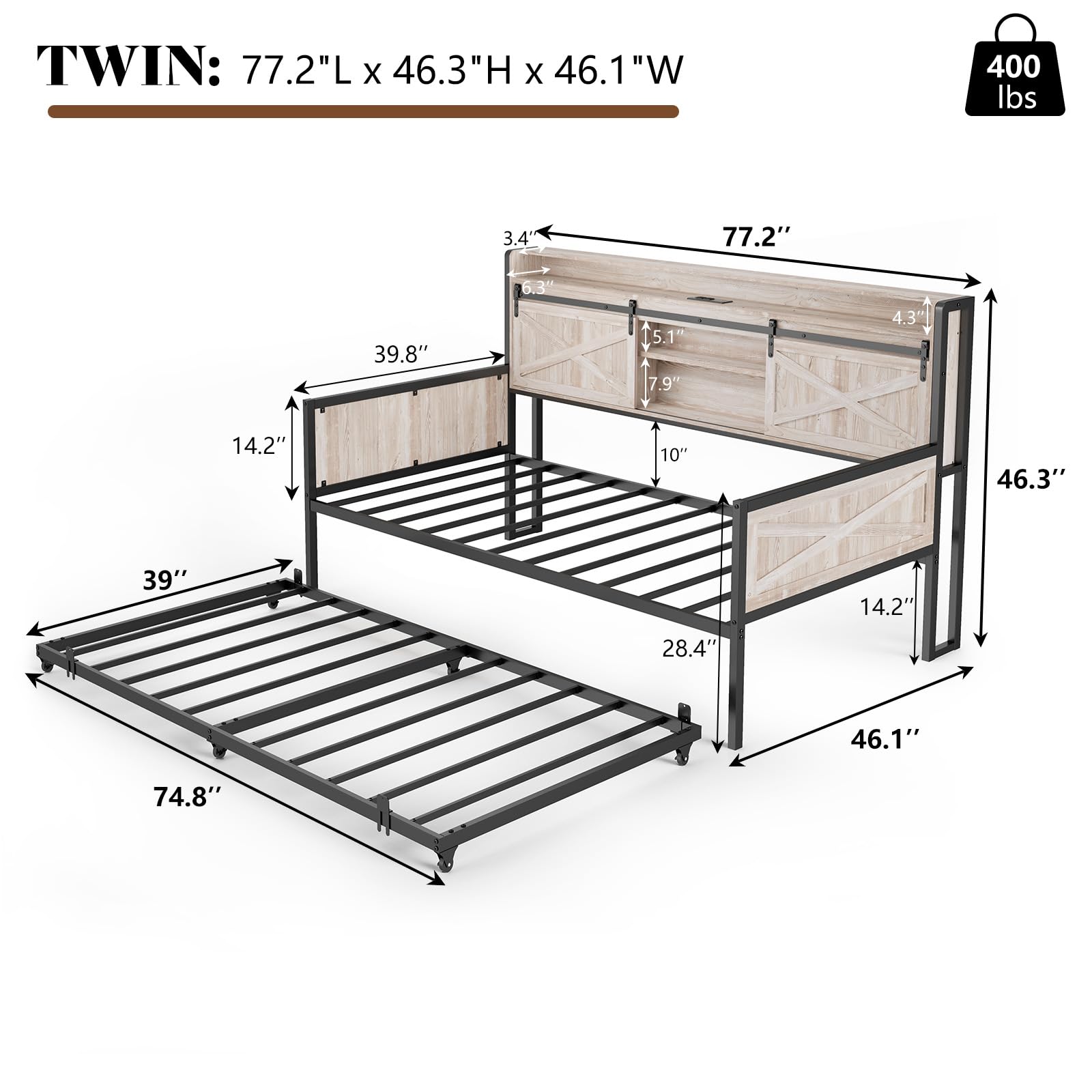 Farmhouse Daybed Frame with Sliding Barn Door Headboard and Charging